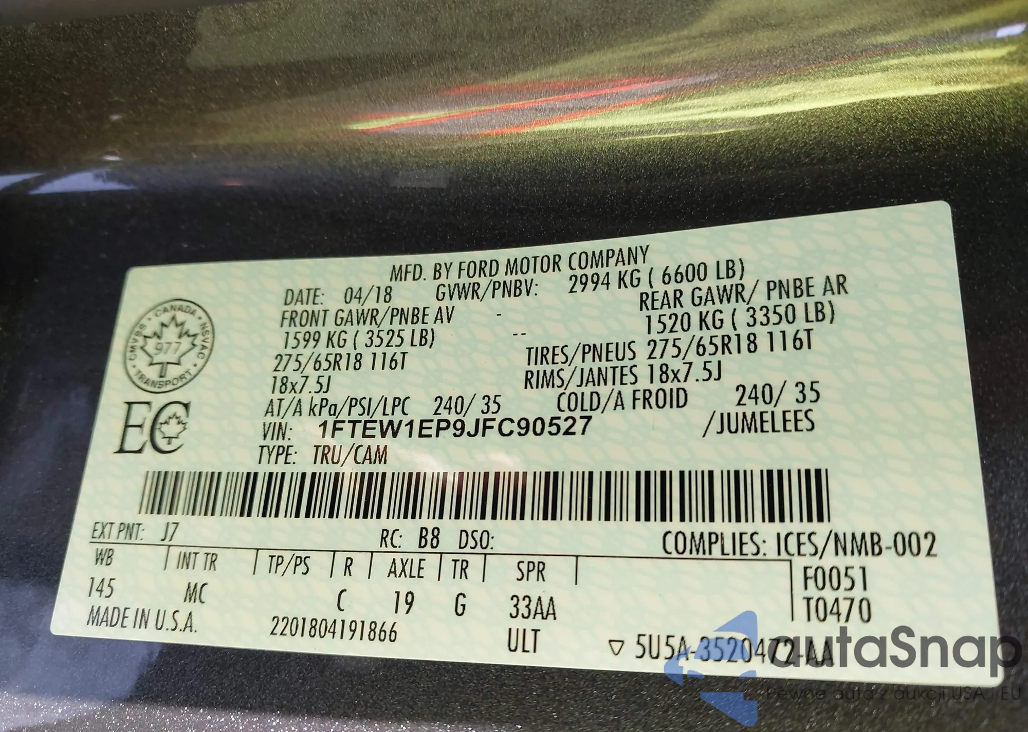 LOT: 43845477 VIN: 1FTEW1EP9JFC90527