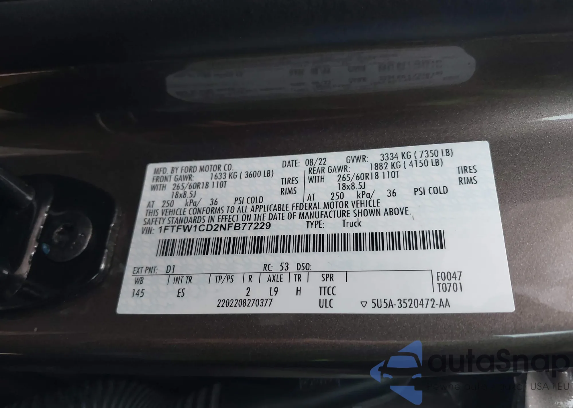 • VIN 1FTFW1CD2NFB77229