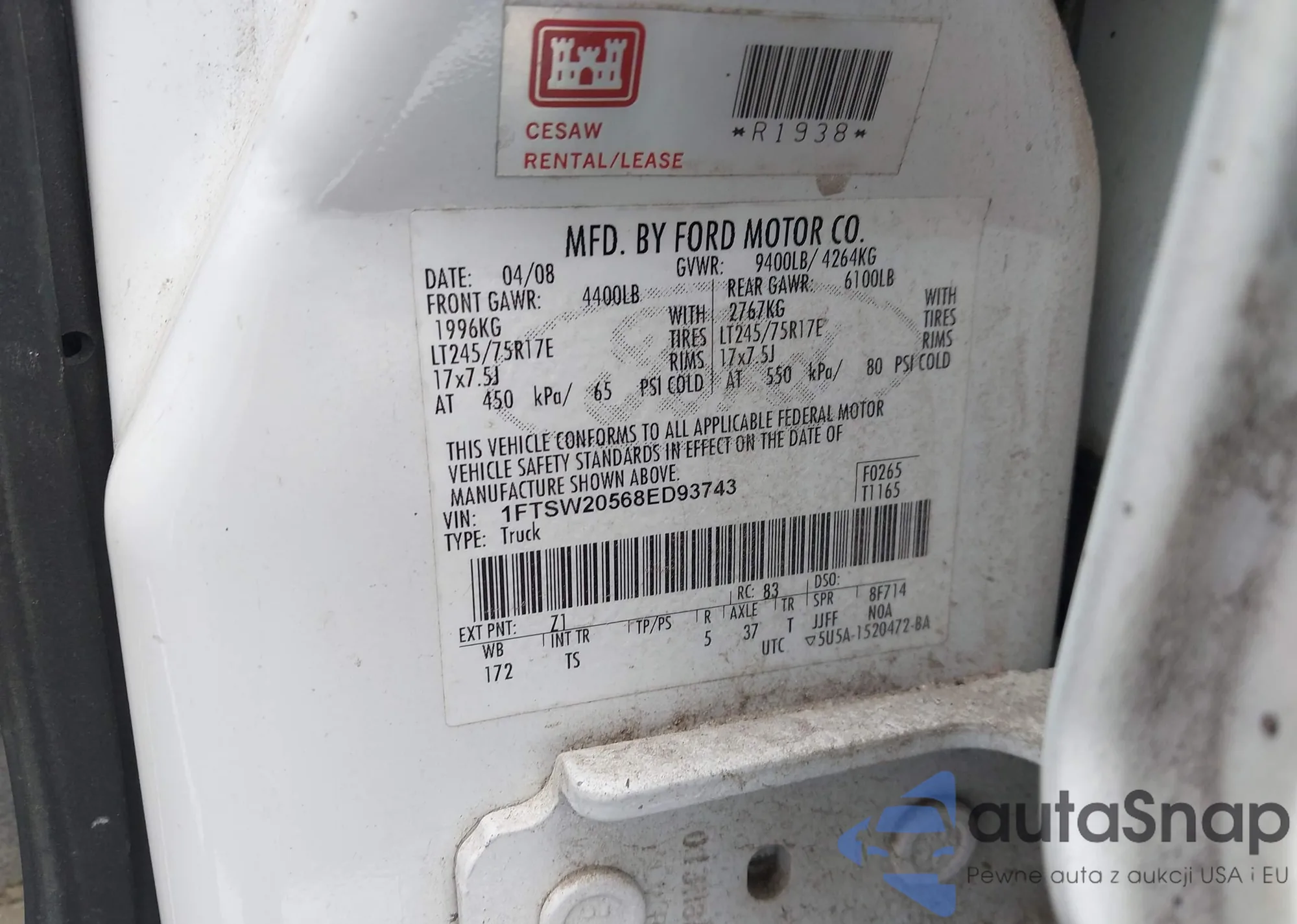 LOT: 42939591 VIN: 1FTSW20568ED93743