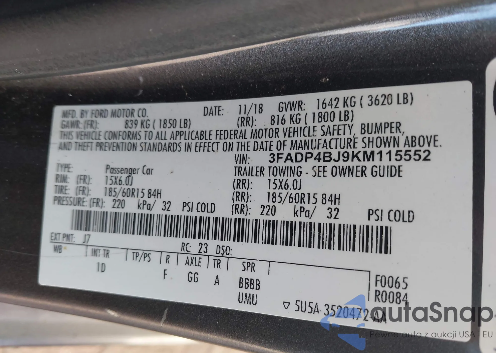 LOT: 43879019 VIN: 3FADP4BJ9KM115552