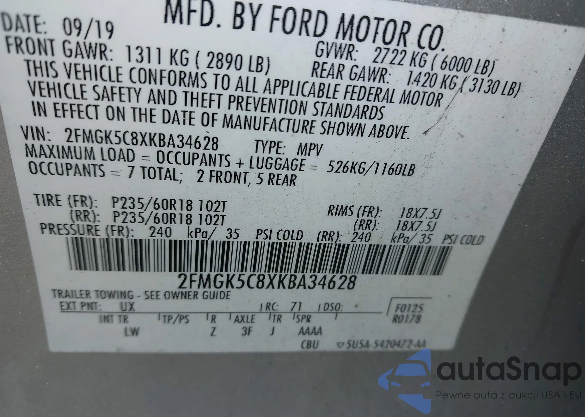 • VIN 2FMGK5C8XKBA34628