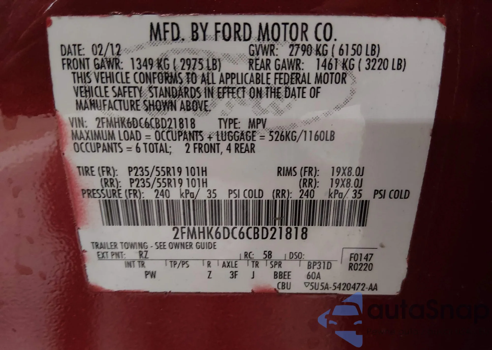 LOT: 44117388 VIN: 2FMHK6DC6CBD21818
