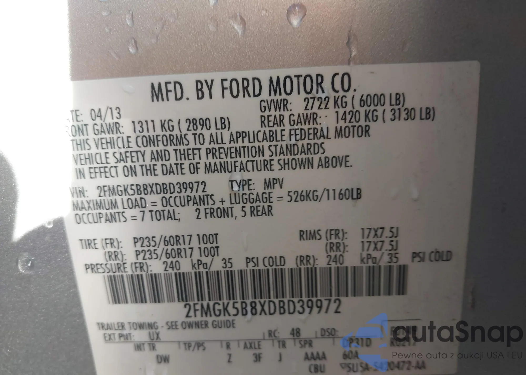 • VIN 2FMGK5B8XDBD39972