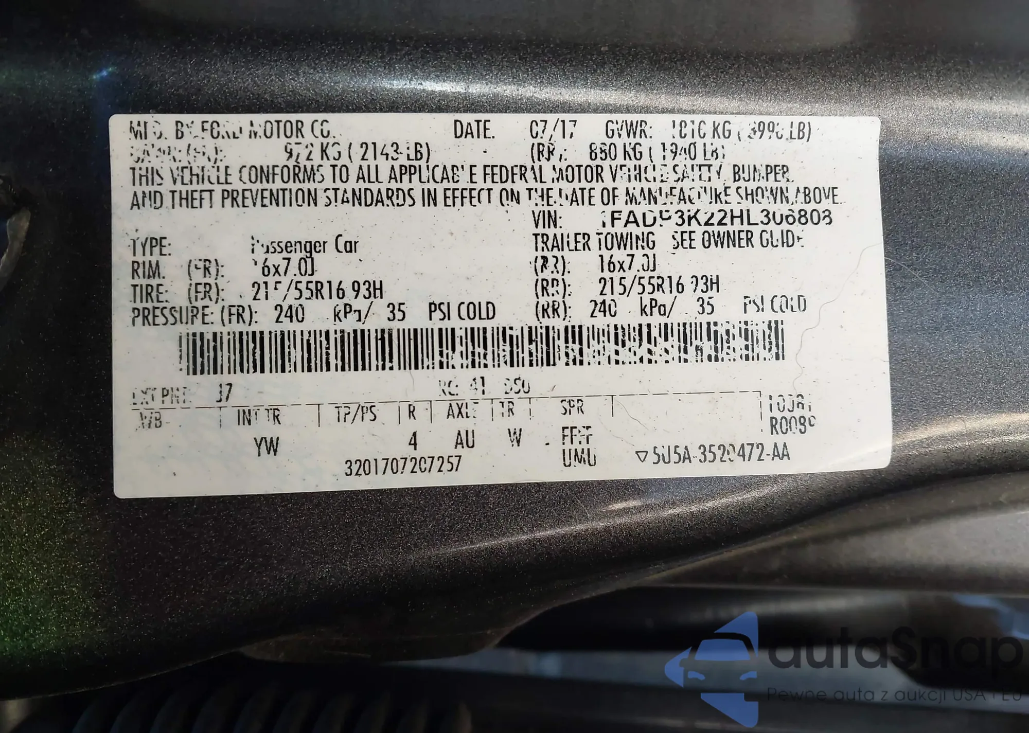 LOT: 44201608 VIN: 1FADP3K22HL306808