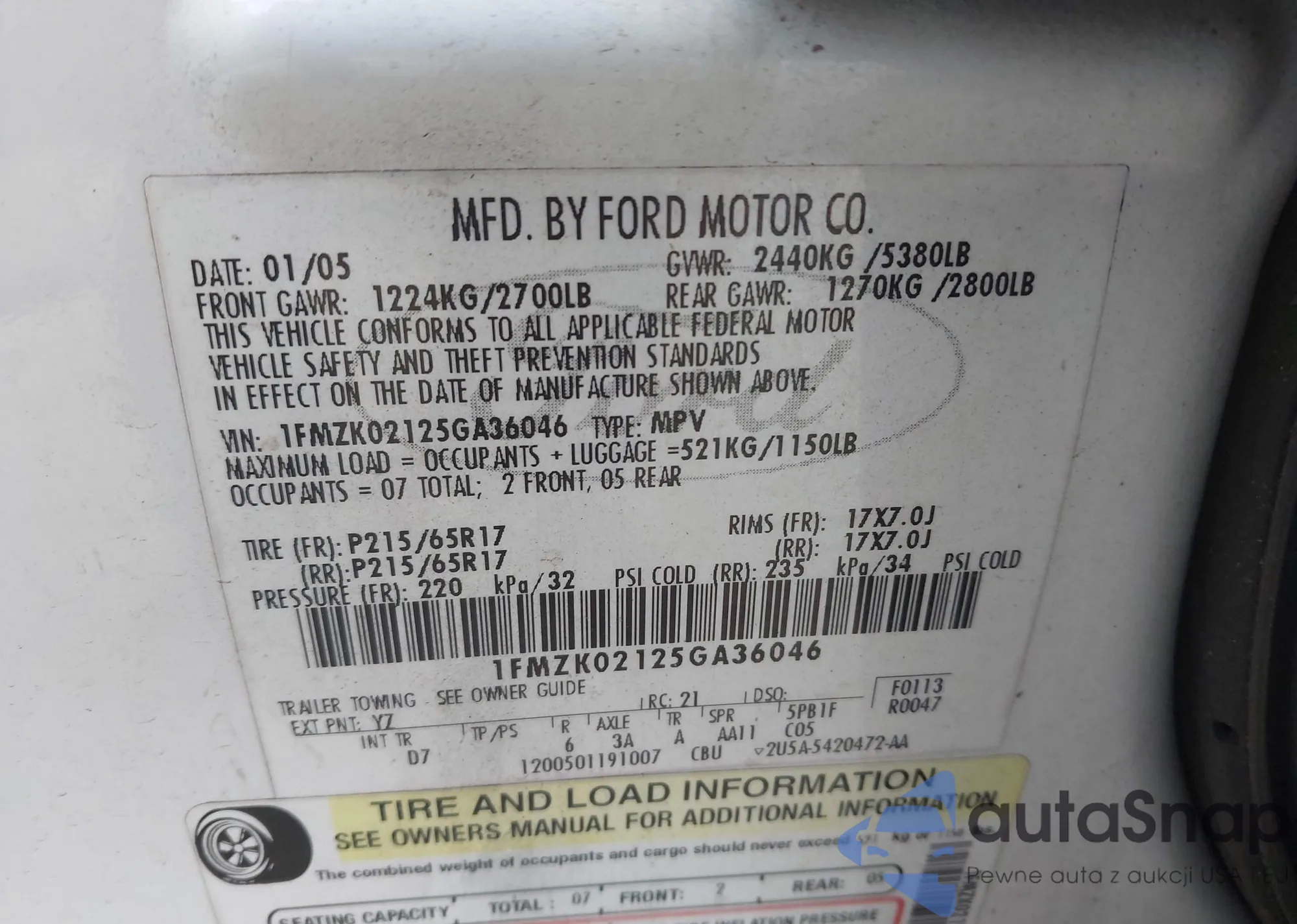 LOT: 44601015 VIN: 1FMZK01125GA49459