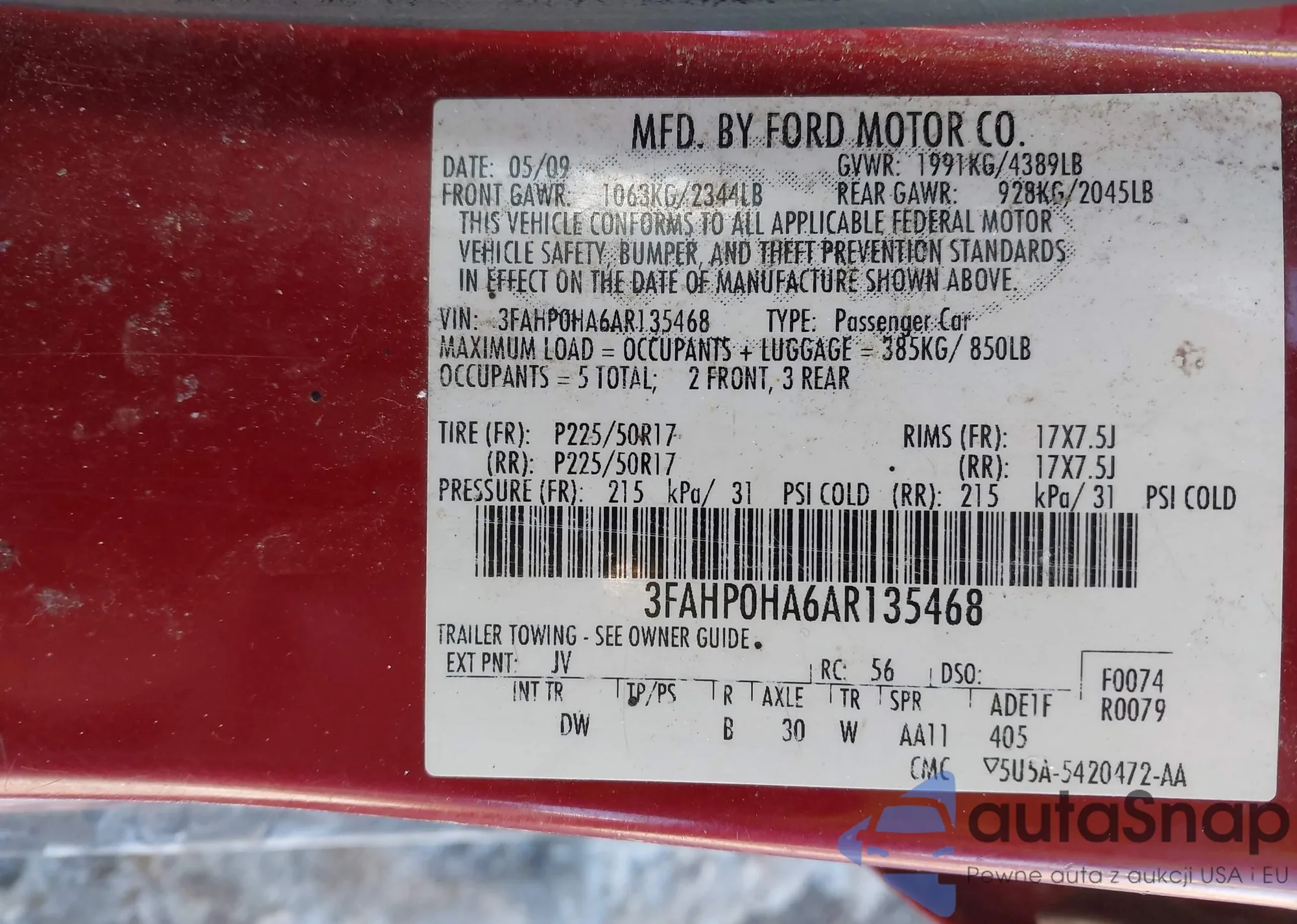 • VIN 3FAHP0HA6AR135468
