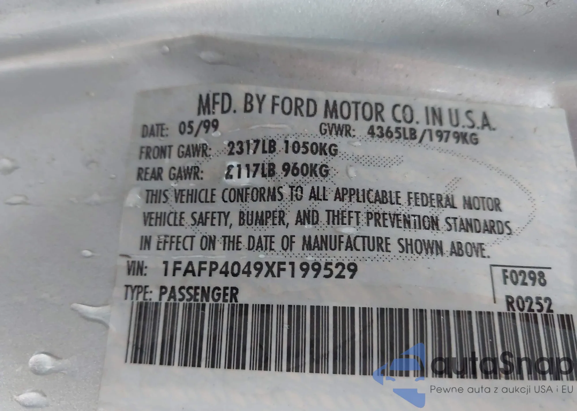 LOT: 44480441 VIN: 1FAFP4049XF199529