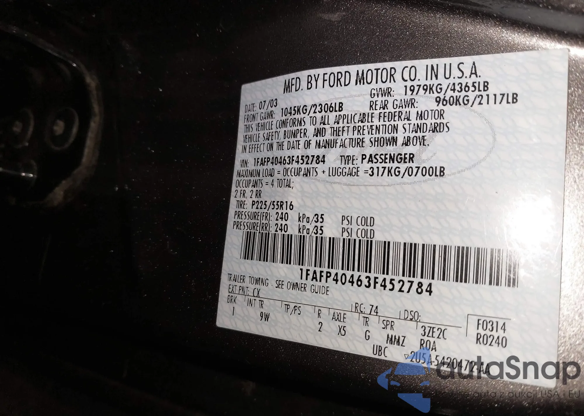 LOT: 44495617 VIN: 1FAFP40463F452784