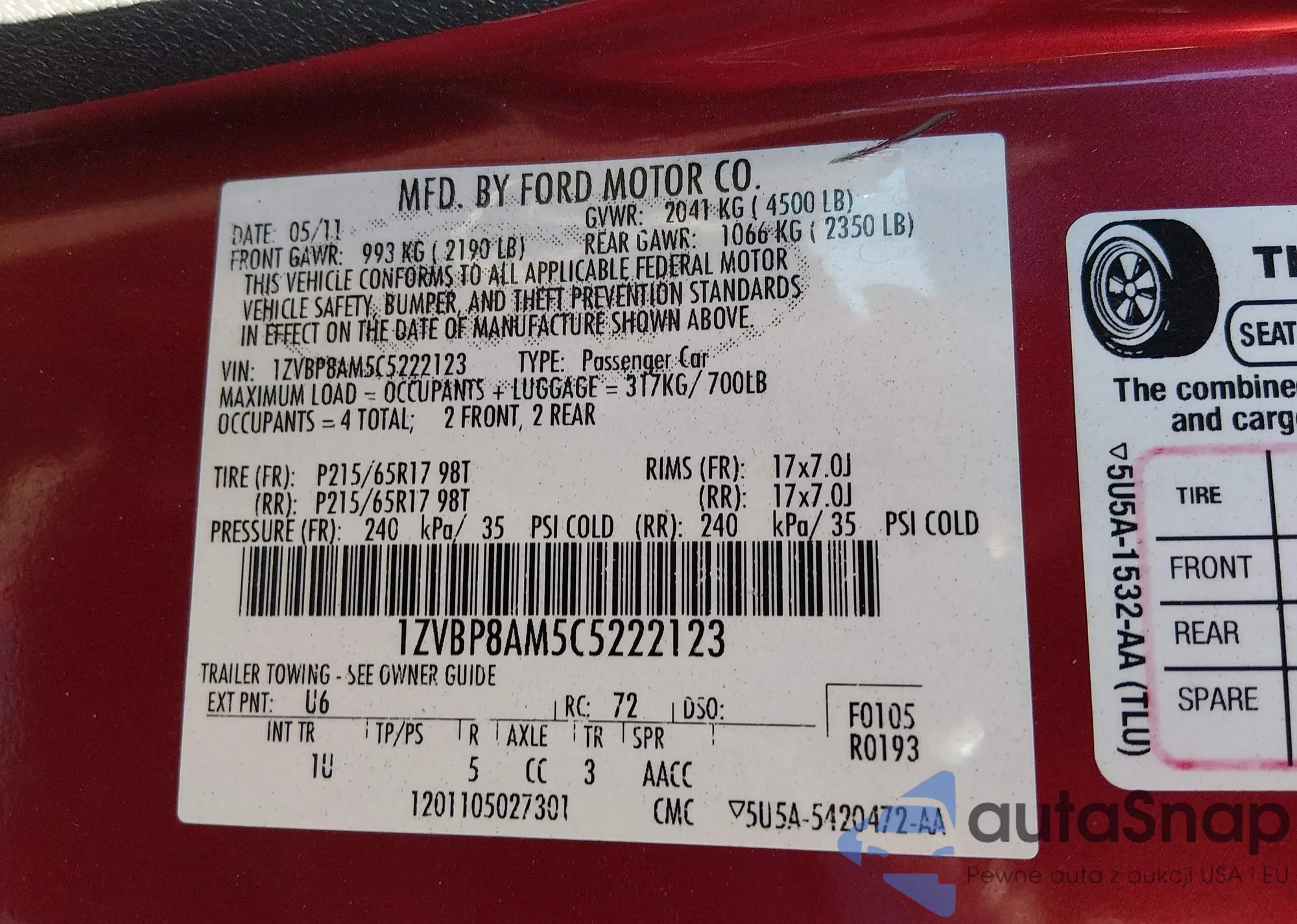 • VIN 1ZVBP8AM5C5222123