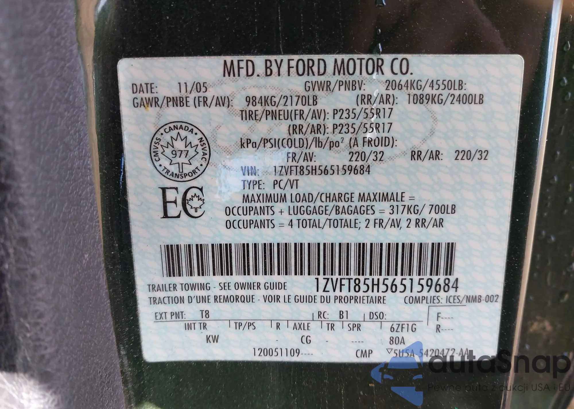 LOT: 44405326 VIN: 1ZVFT85H565159684