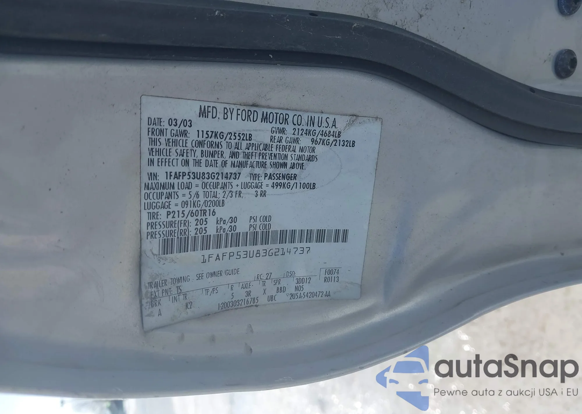 LOT: 44287597 VIN: 1FAFP53U83G214737