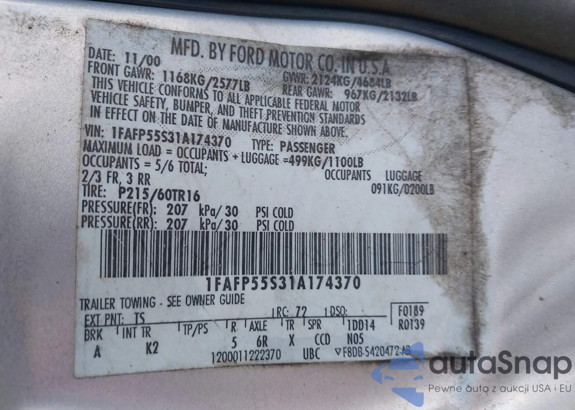LOT: 44300556 VIN: 1FAFP55S31A174370