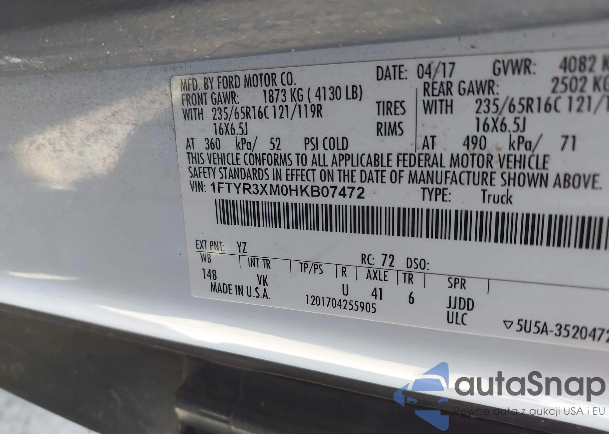 • VIN 1FTYR3XM0HKB07472