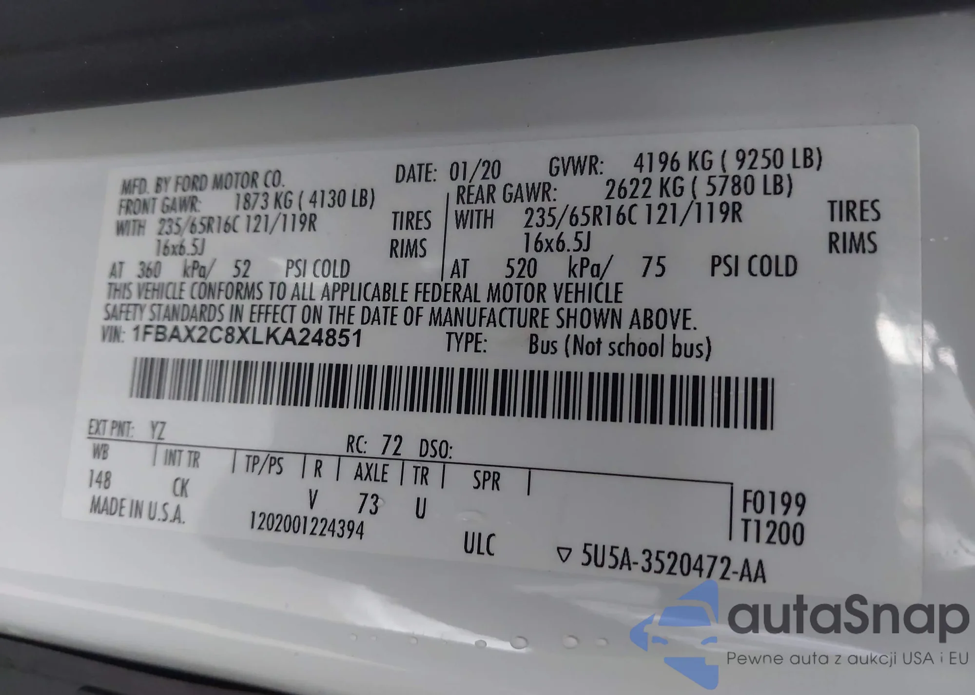 LOT: 44202359 VIN: 1FBAX2C8XLKA24851