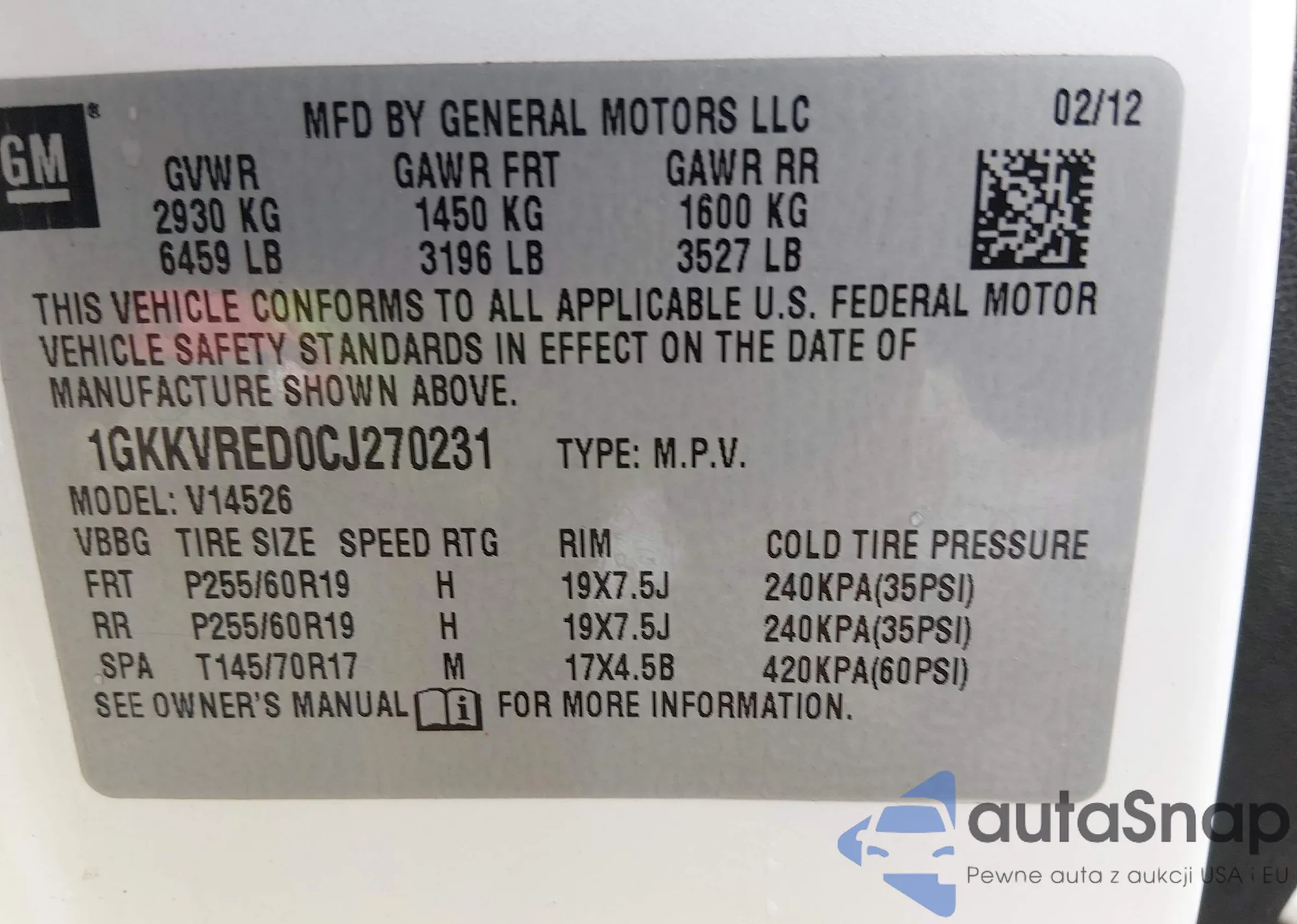 • VIN 1GKKVRED0CJ270231