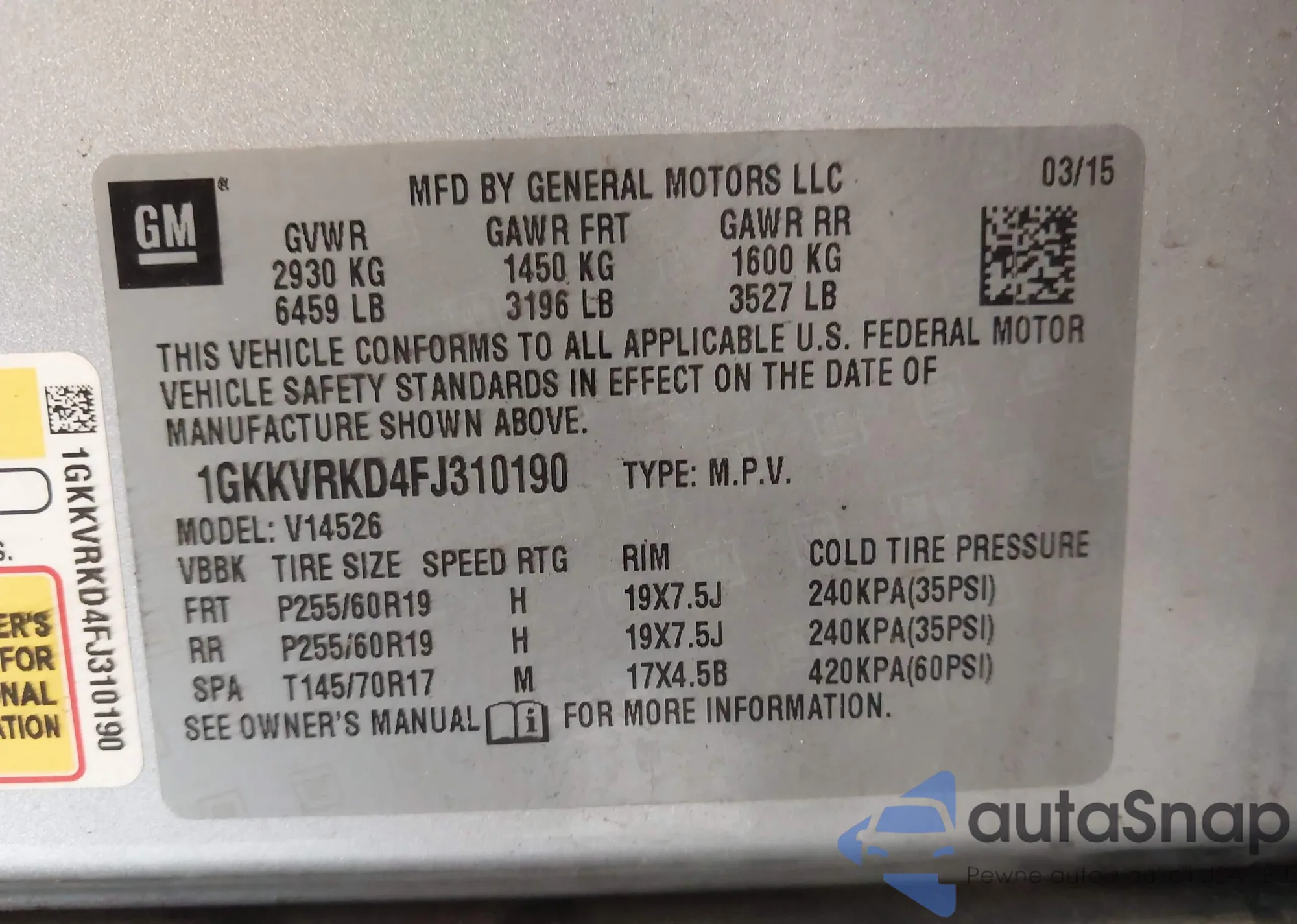 LOT: 44332106 VIN: 1GKKVRKD4FJ310190