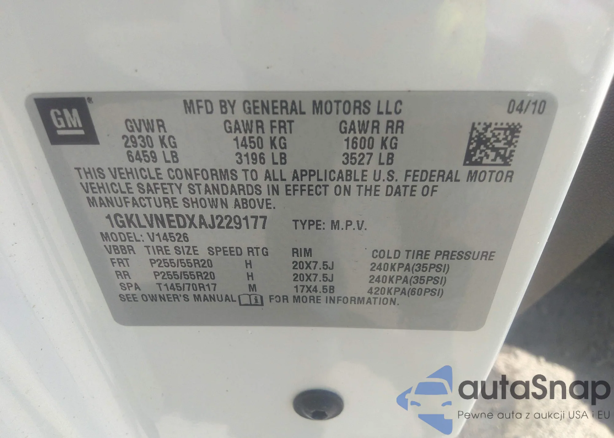• VIN 1GKLVNEDXAJ229177