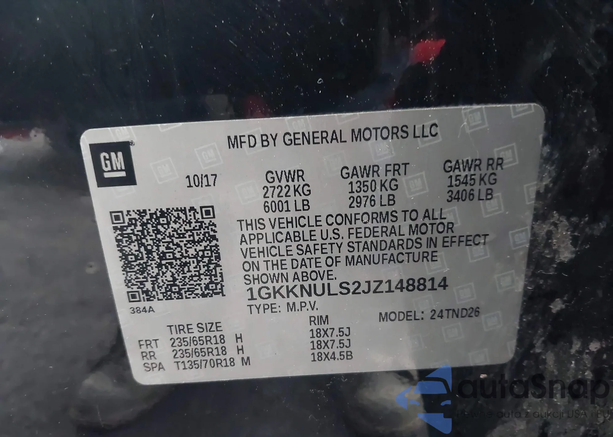 LOT: 80270325 VIN: 1GKKNLLA6HZ148925