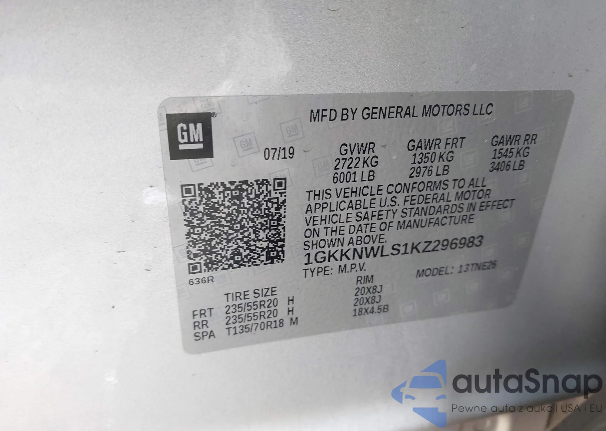 • VIN 1GKKNWLS1KZ296983