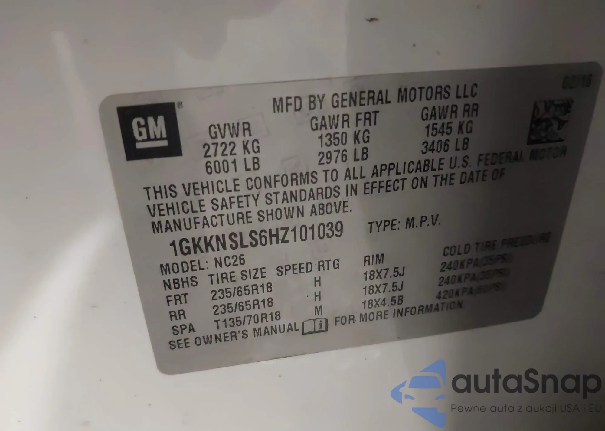 LOT: 43506389 VIN: 1GKKNLLS6HZ175258