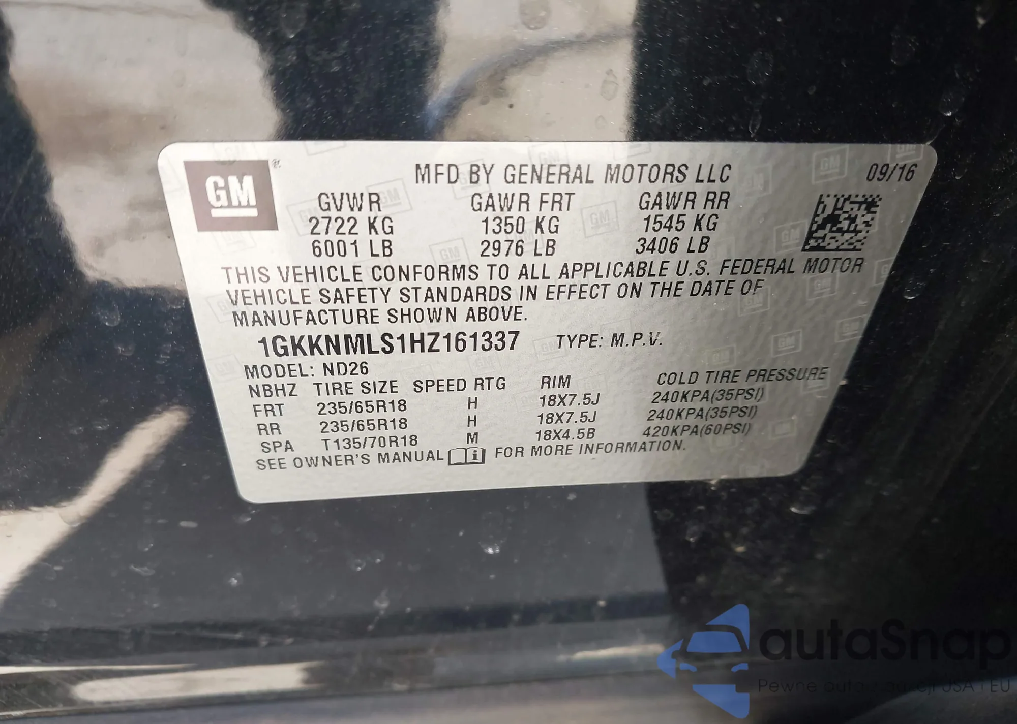 • VIN 1GKKNMLS1HZ161337