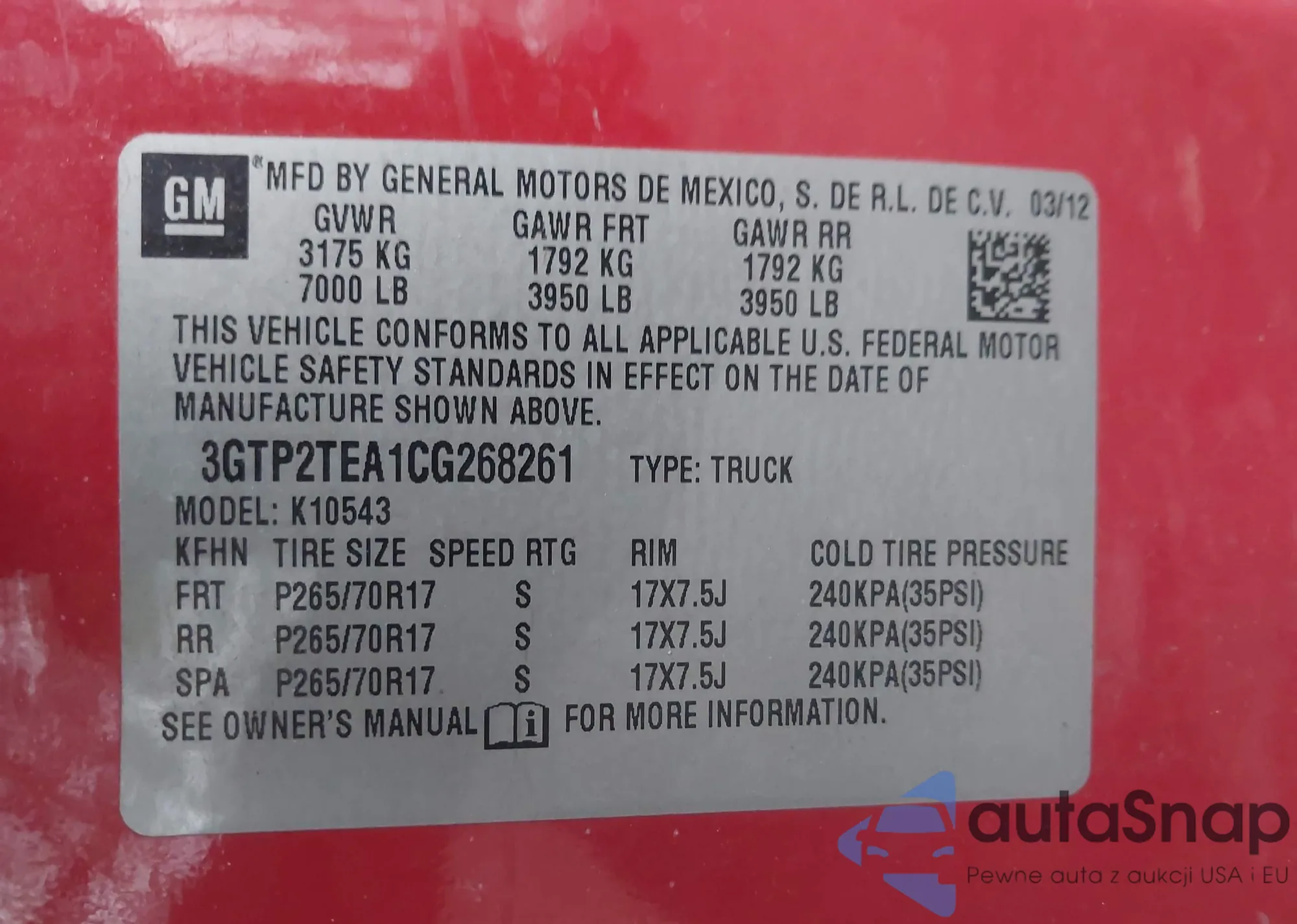 LOT: 43976210 VIN: 3GTP2TEA1CG268261
