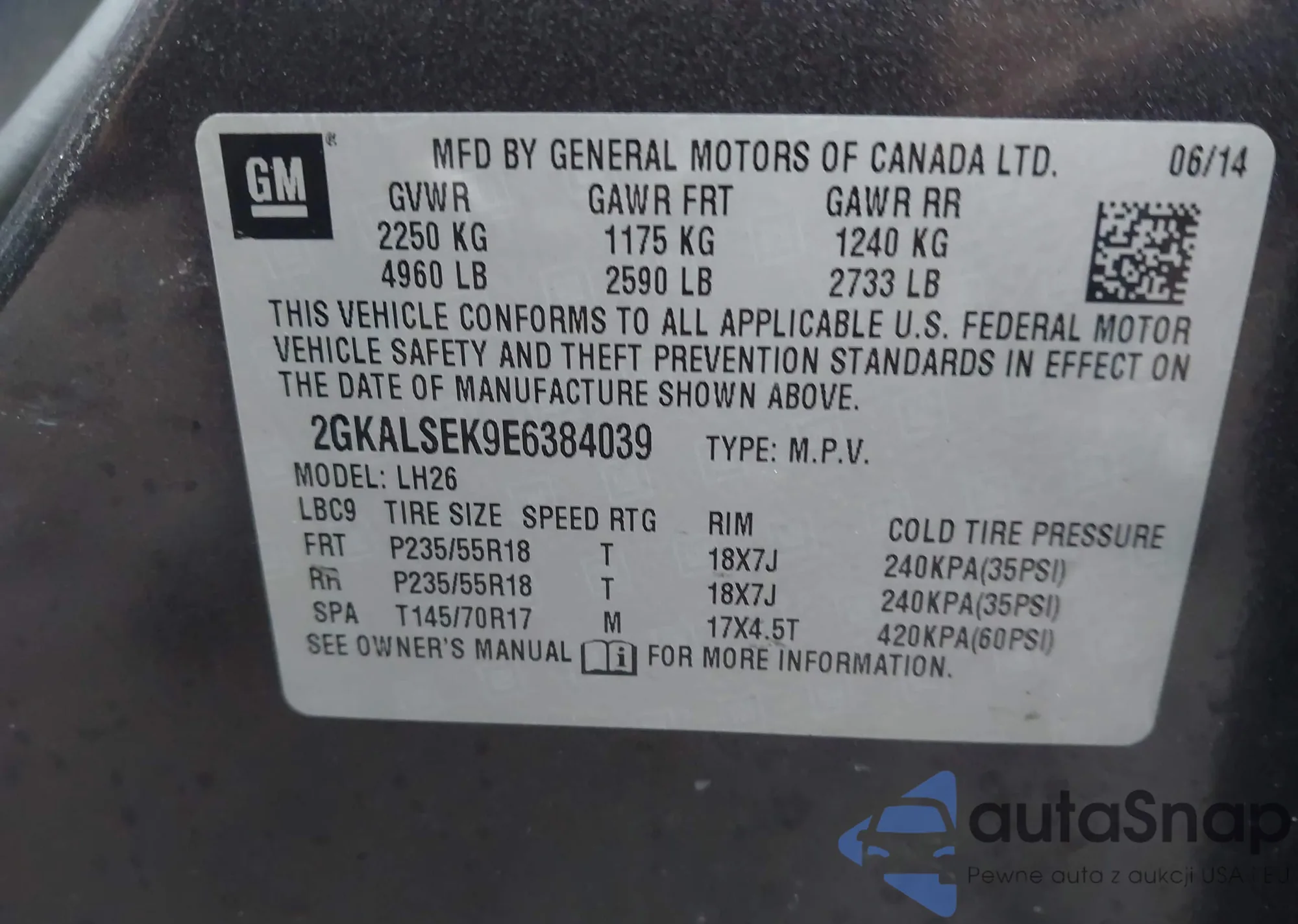• VIN 2GKALSEK9E6384039
