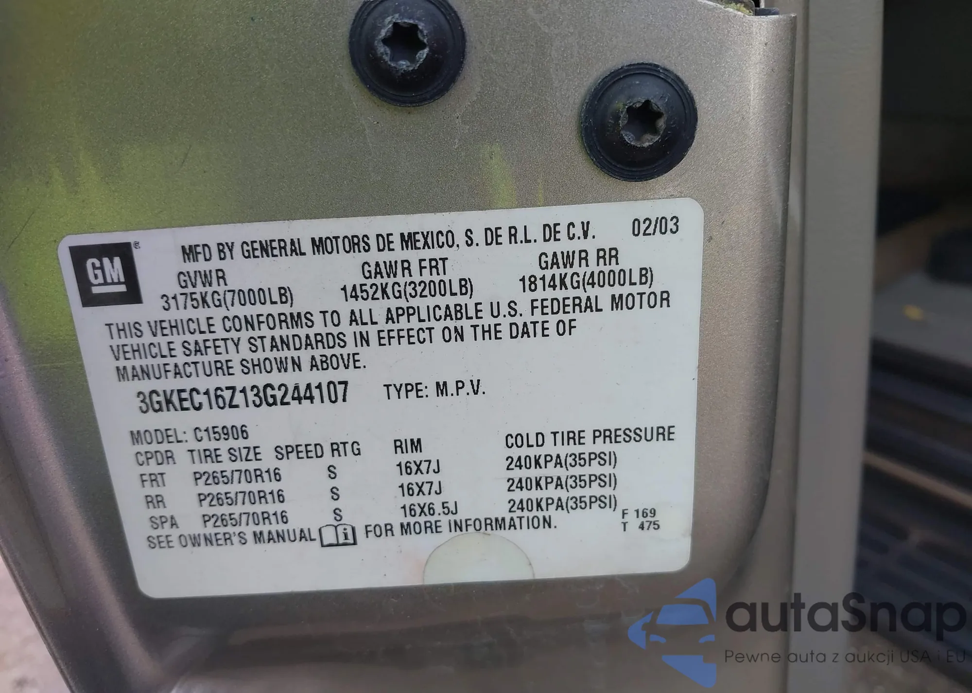 • VIN 3GKEC16Z13G244107