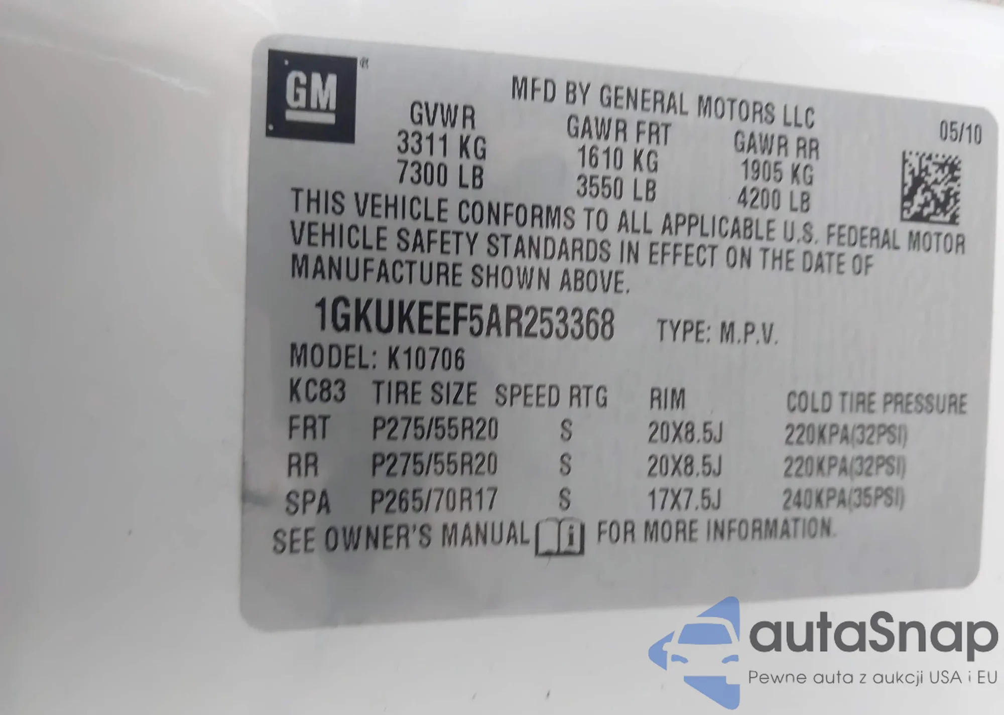 • VIN 1GKUKEEF5AR253368