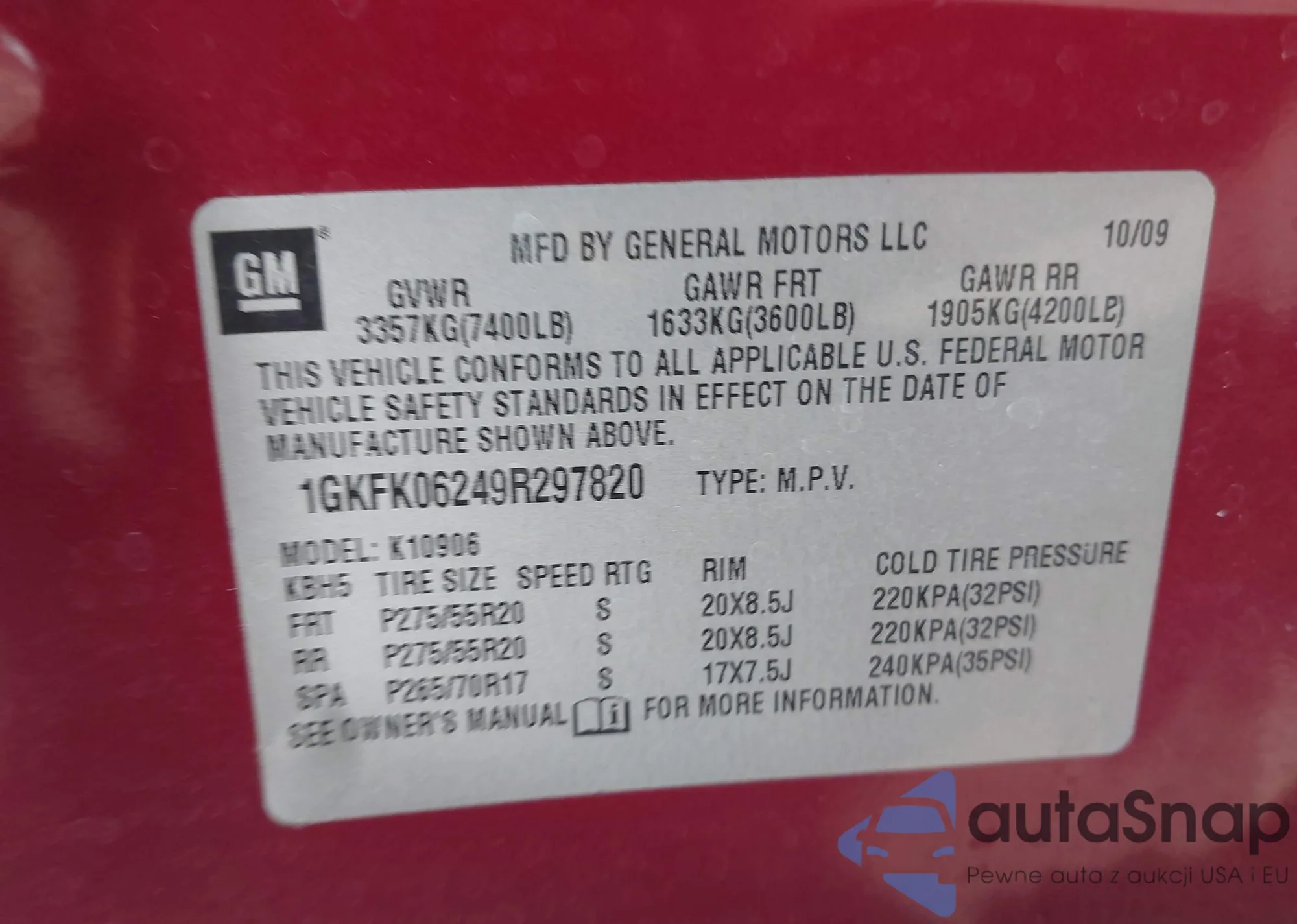 LOT: 43895398 VIN: 1GKFK06249R297820