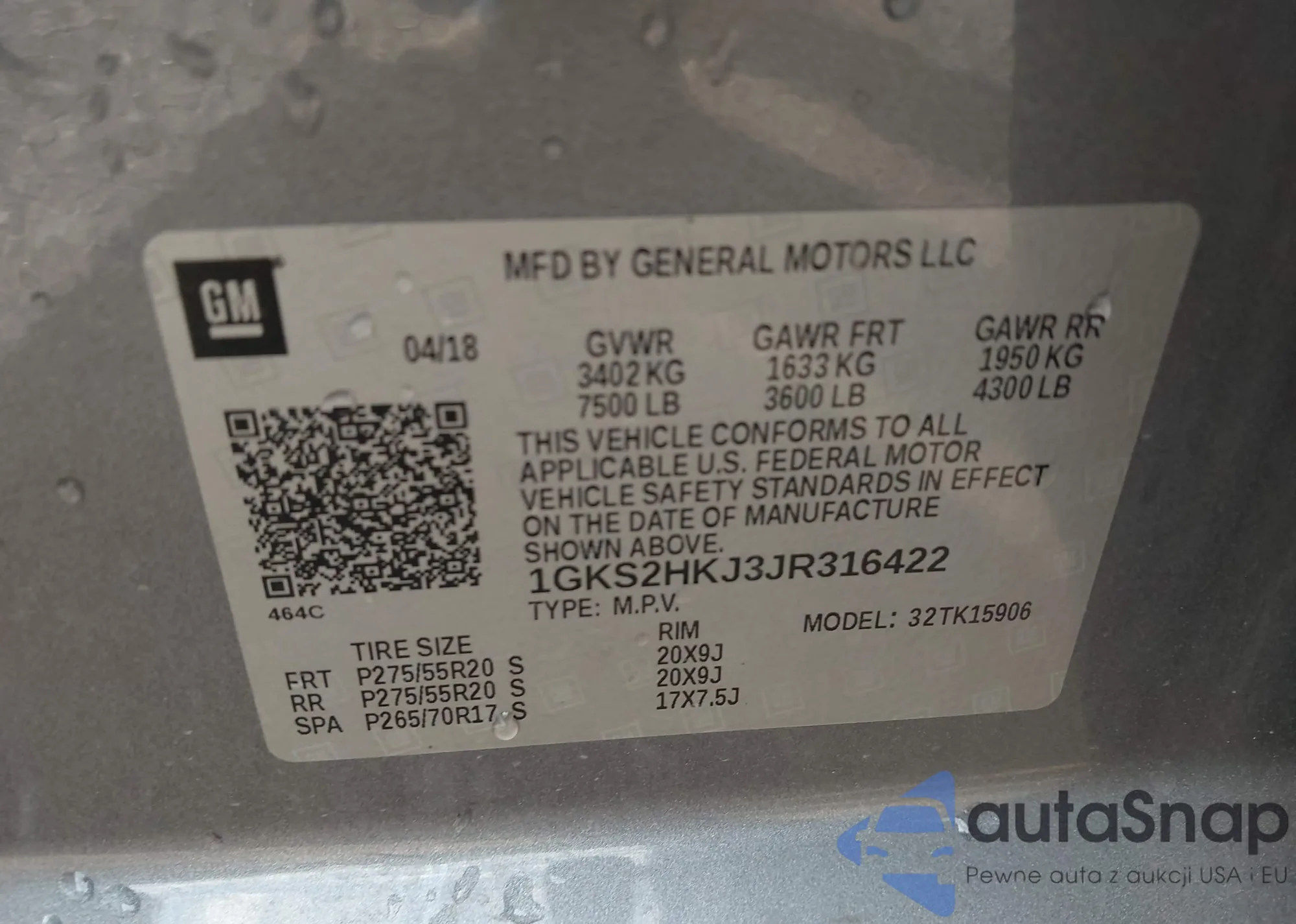 LOT: 43758260 VIN: 1GKS2HKJ3JR316422