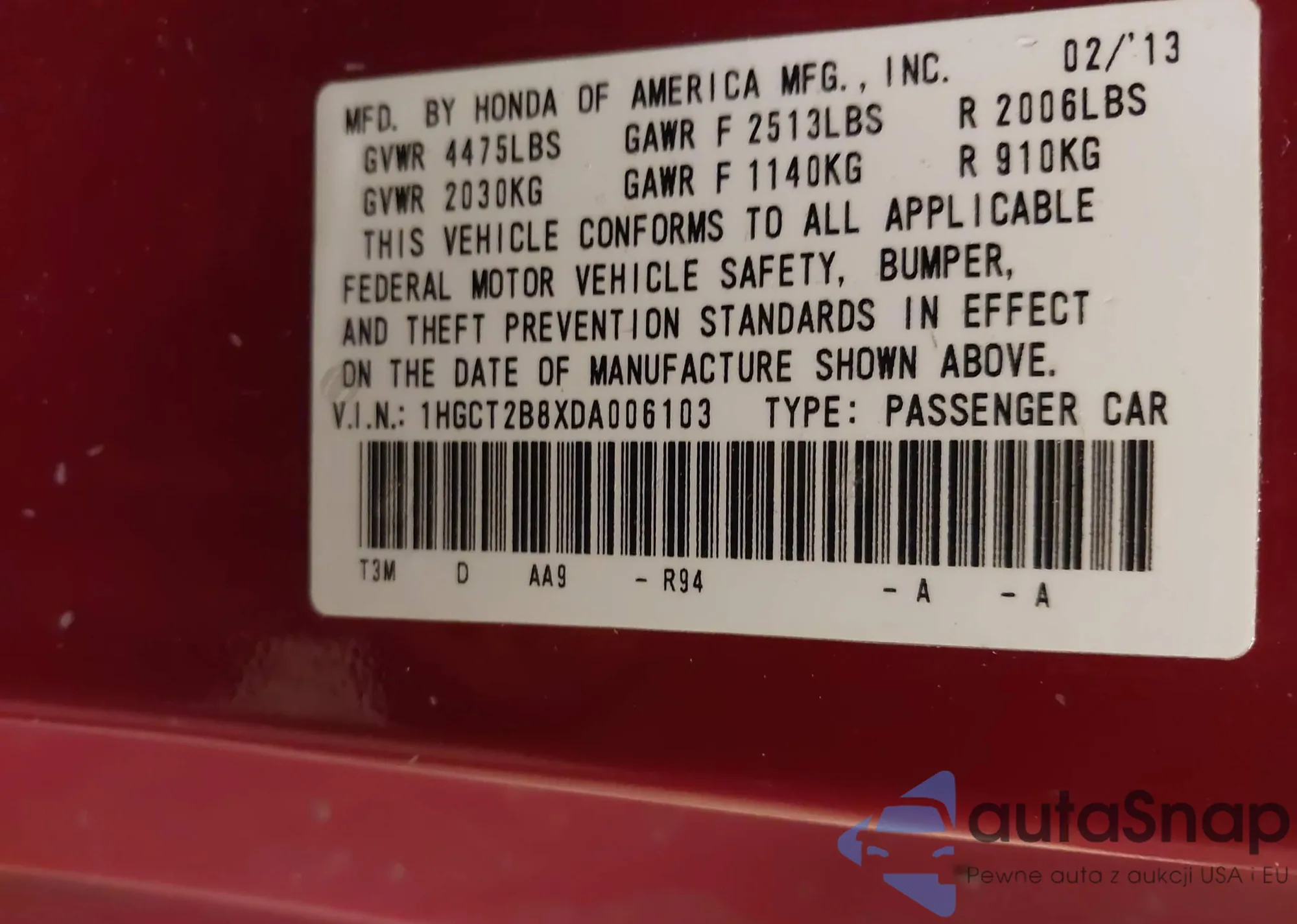 • VIN 1HGCT2B8XDA006103