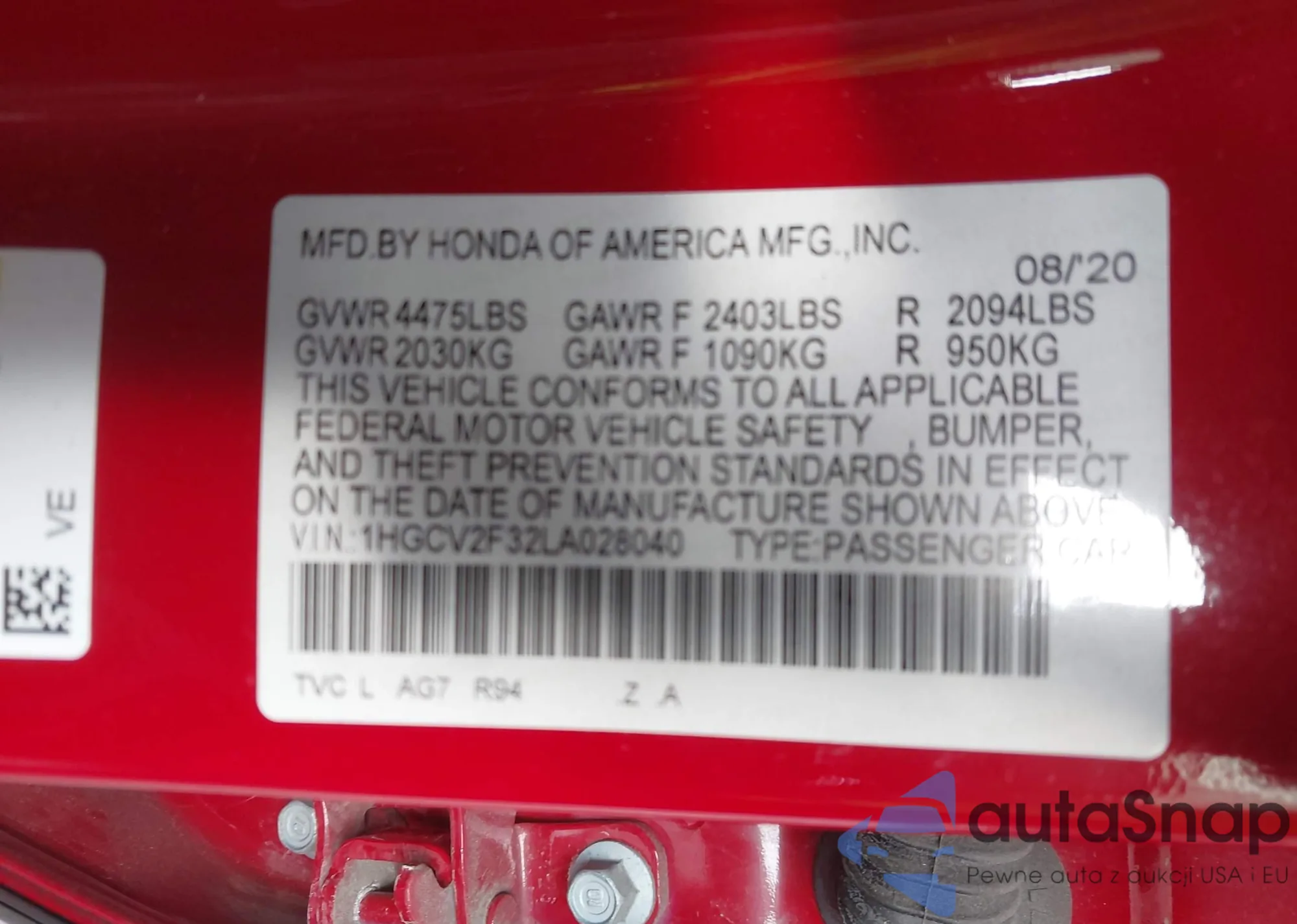 LOT: 43624625 VIN: 1HGCV2F32LA028040