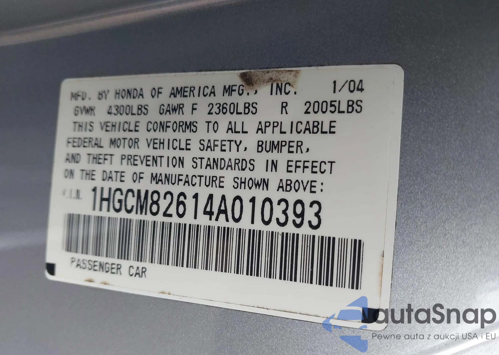 LOT: 44649822 VIN: 1HGCM82614A010393