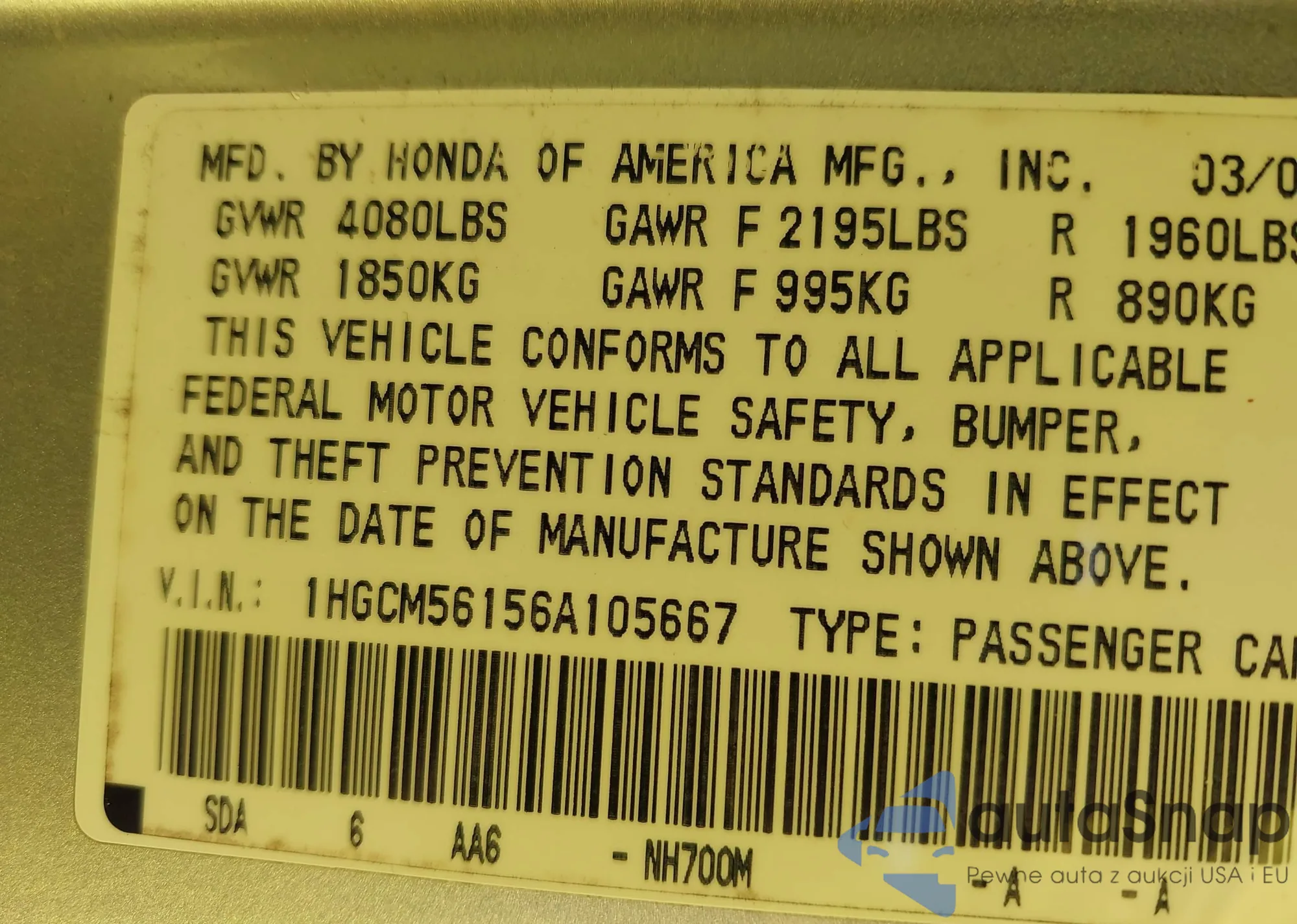 LOT: 44070947 VIN: 1HGCM563X4A165670