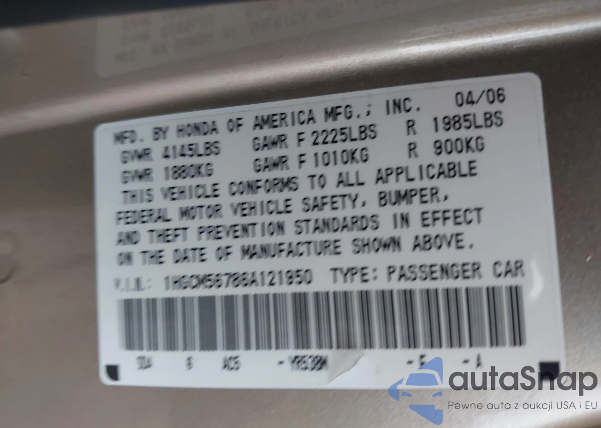 LOT: 44007462 VIN: 1HGCM56786A121950