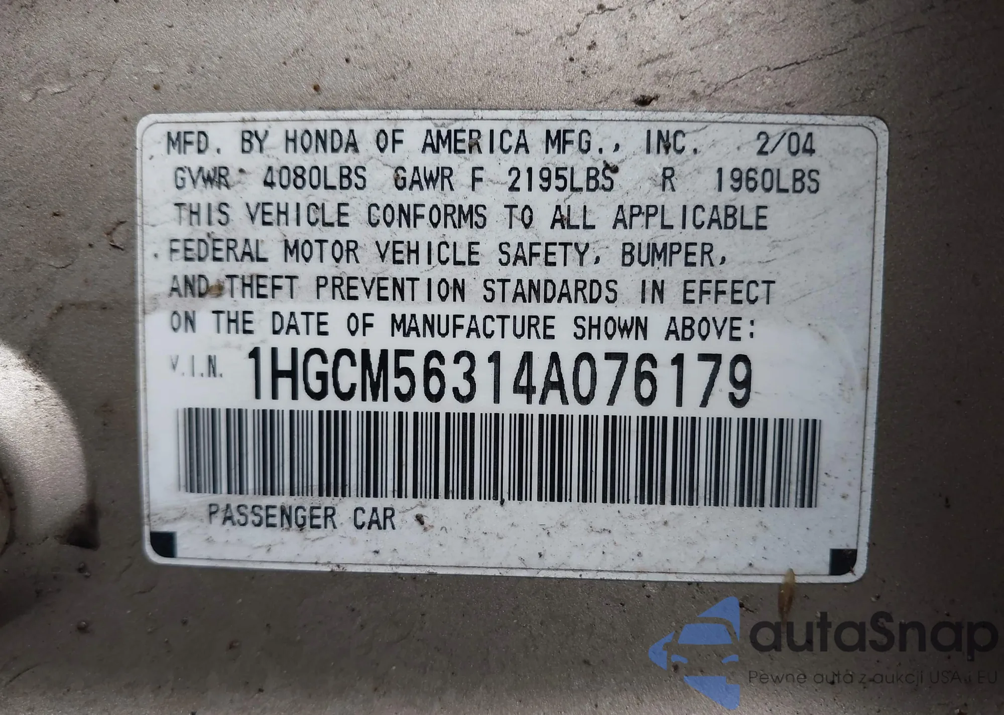 LOT: 44052923 VIN: 1HGCM56314A076179