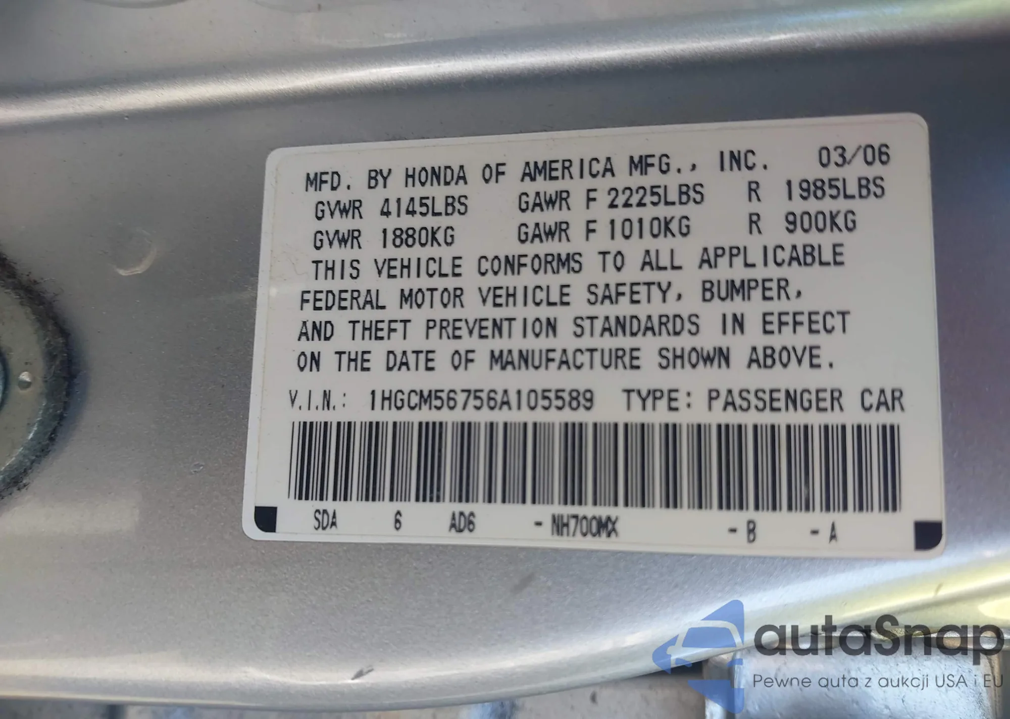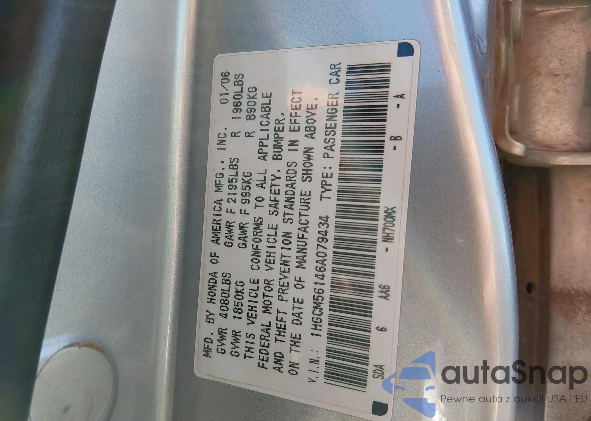 LOT: 44217808 VIN: 1HGCM56146A079434