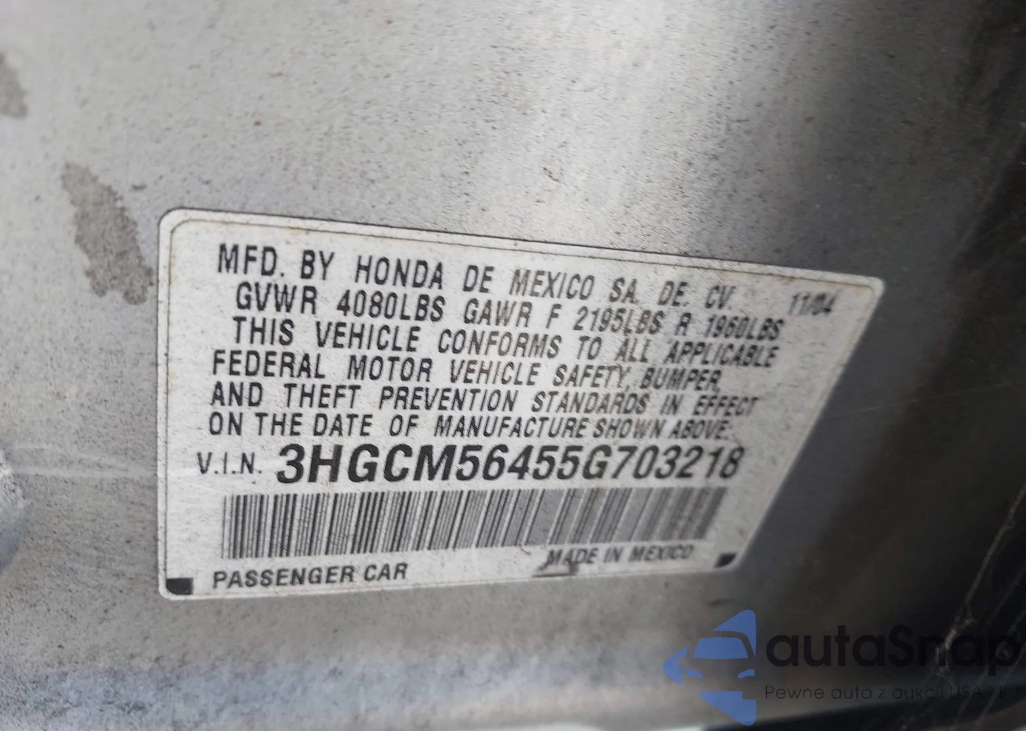 LOT: 44612562 VIN: 3HGCM56455G703218