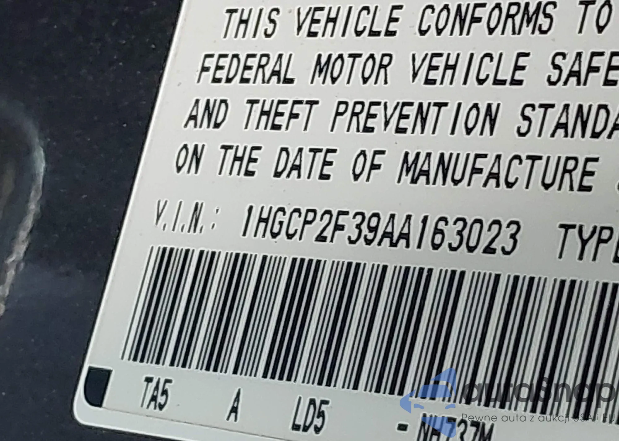 LOT: 44605047 VIN: 1HGCP2F39AA163023