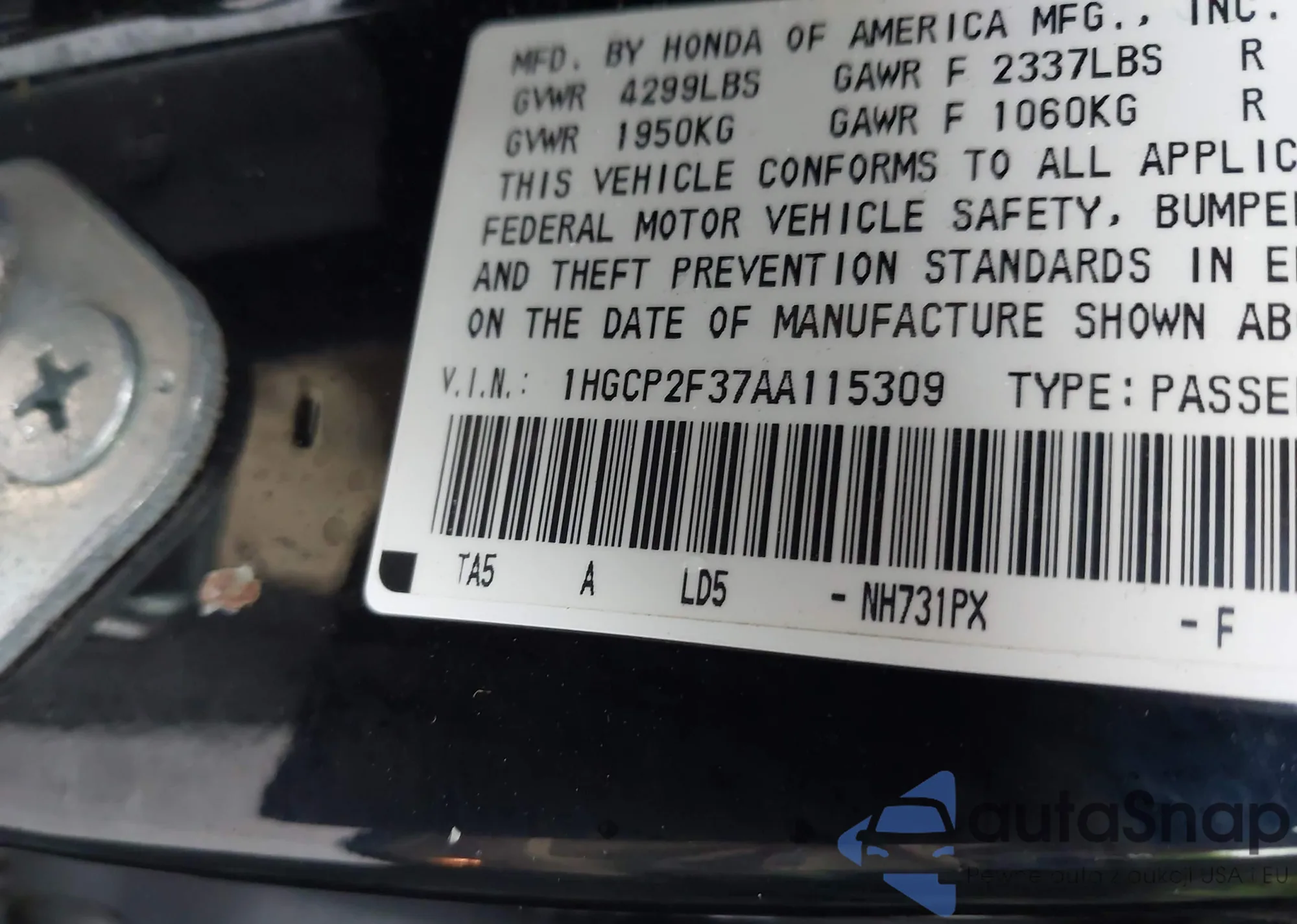 LOT: 44615382 VIN: 1HGCP2F37AA115309