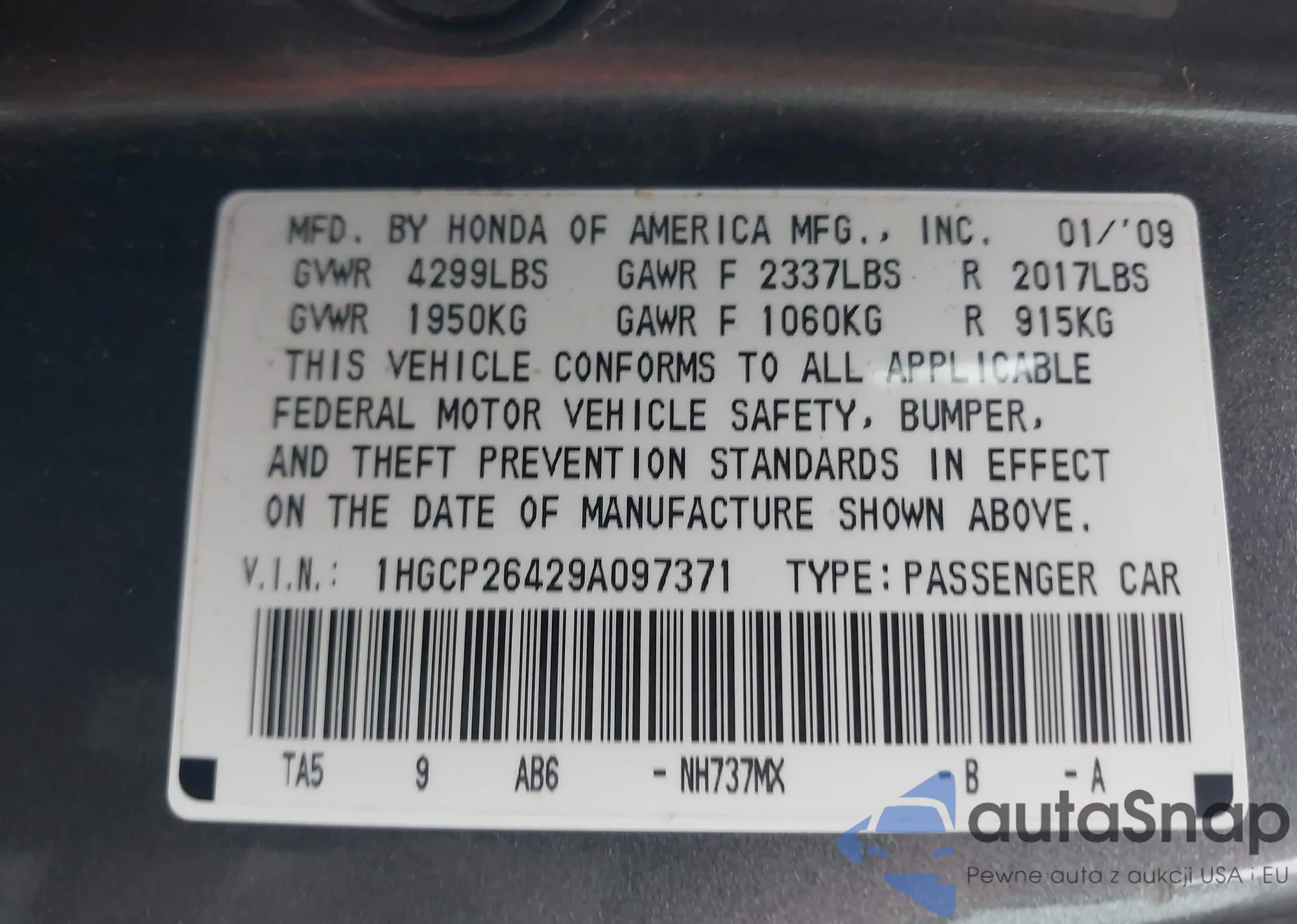 LOT: 44617129 VIN: 1HGCP26429A097371