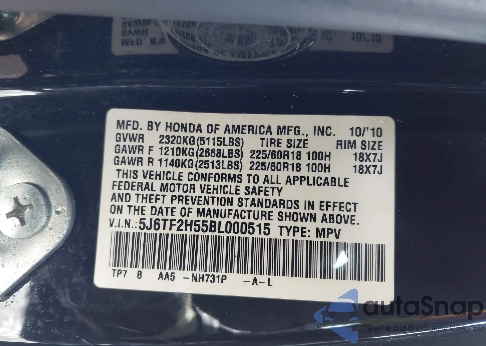 • VIN 5J6TF2H55BL000515
