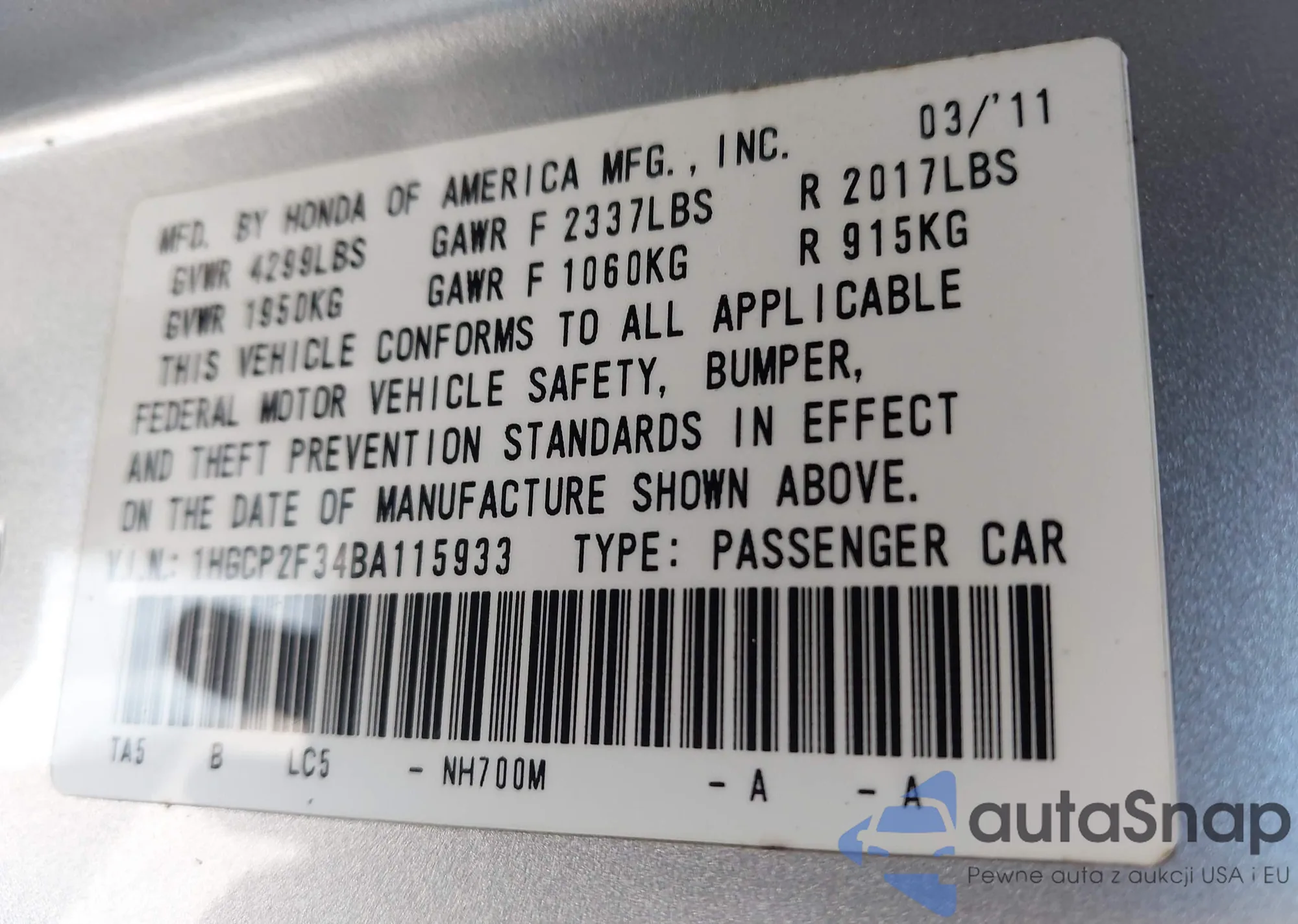 LOT: 44672385 VIN: 1HGCP2F34BA115933