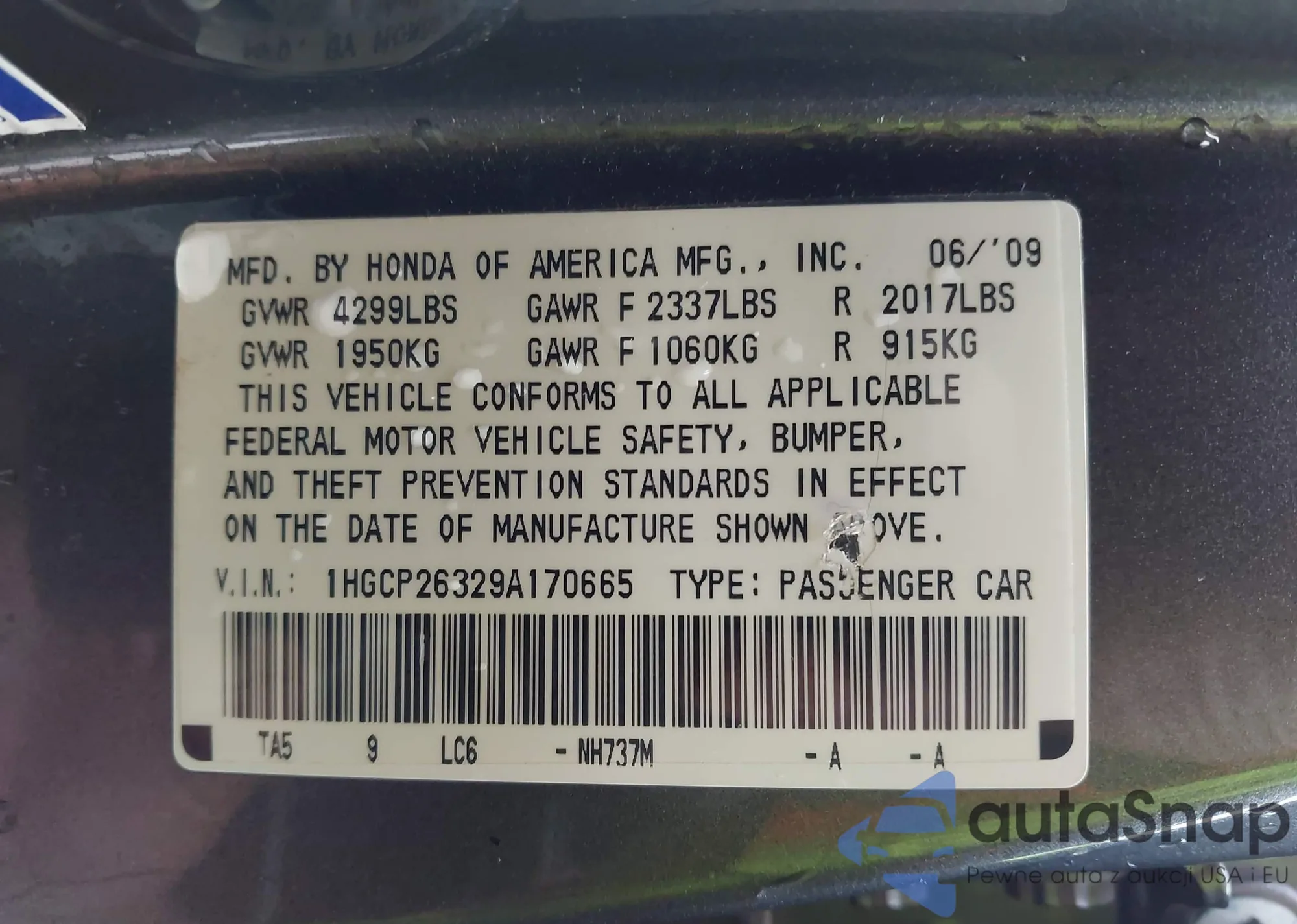 • VIN 1HGCP26329A170665