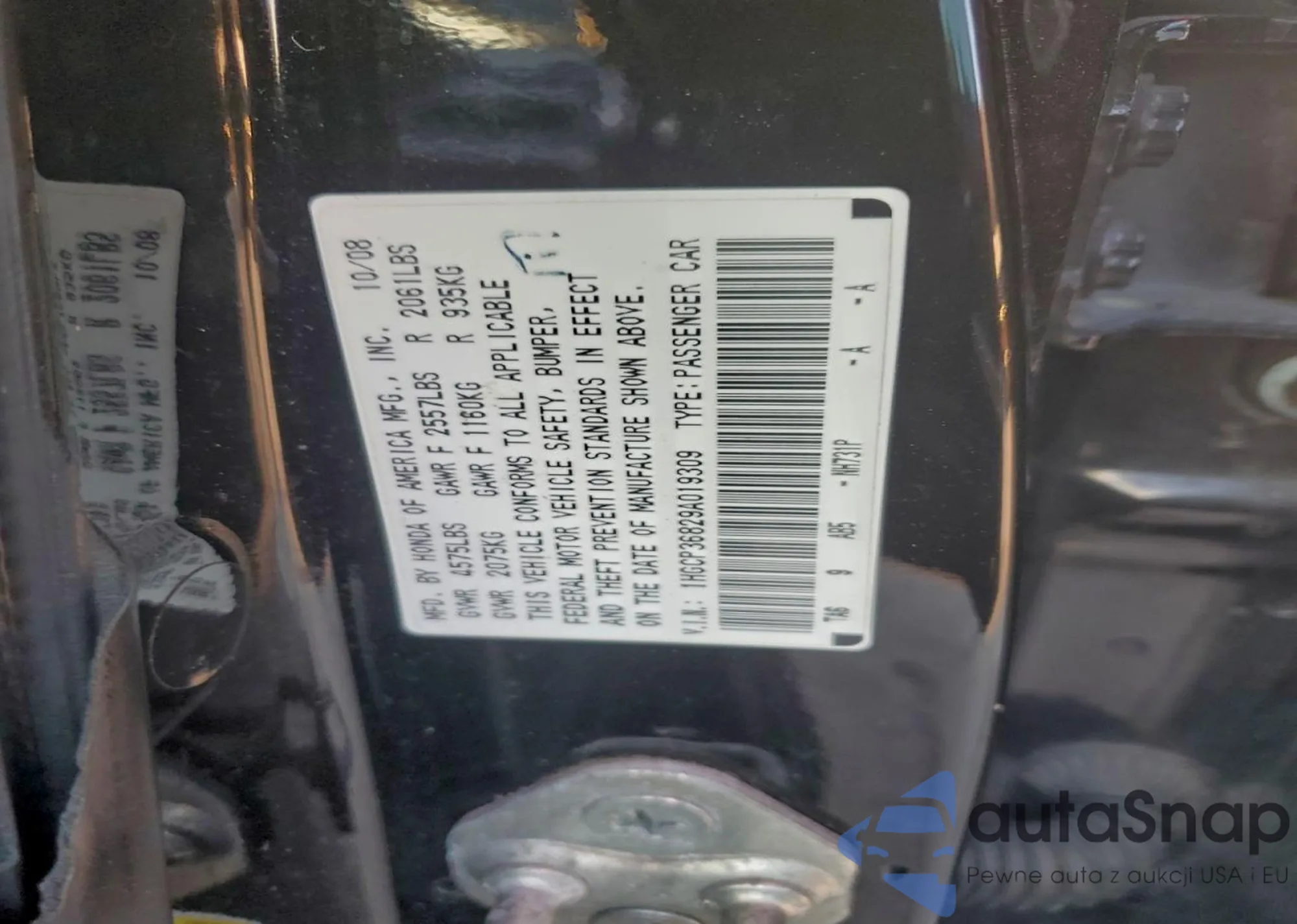 LOT: 97803925 VIN: 1HGCP36829A019309
