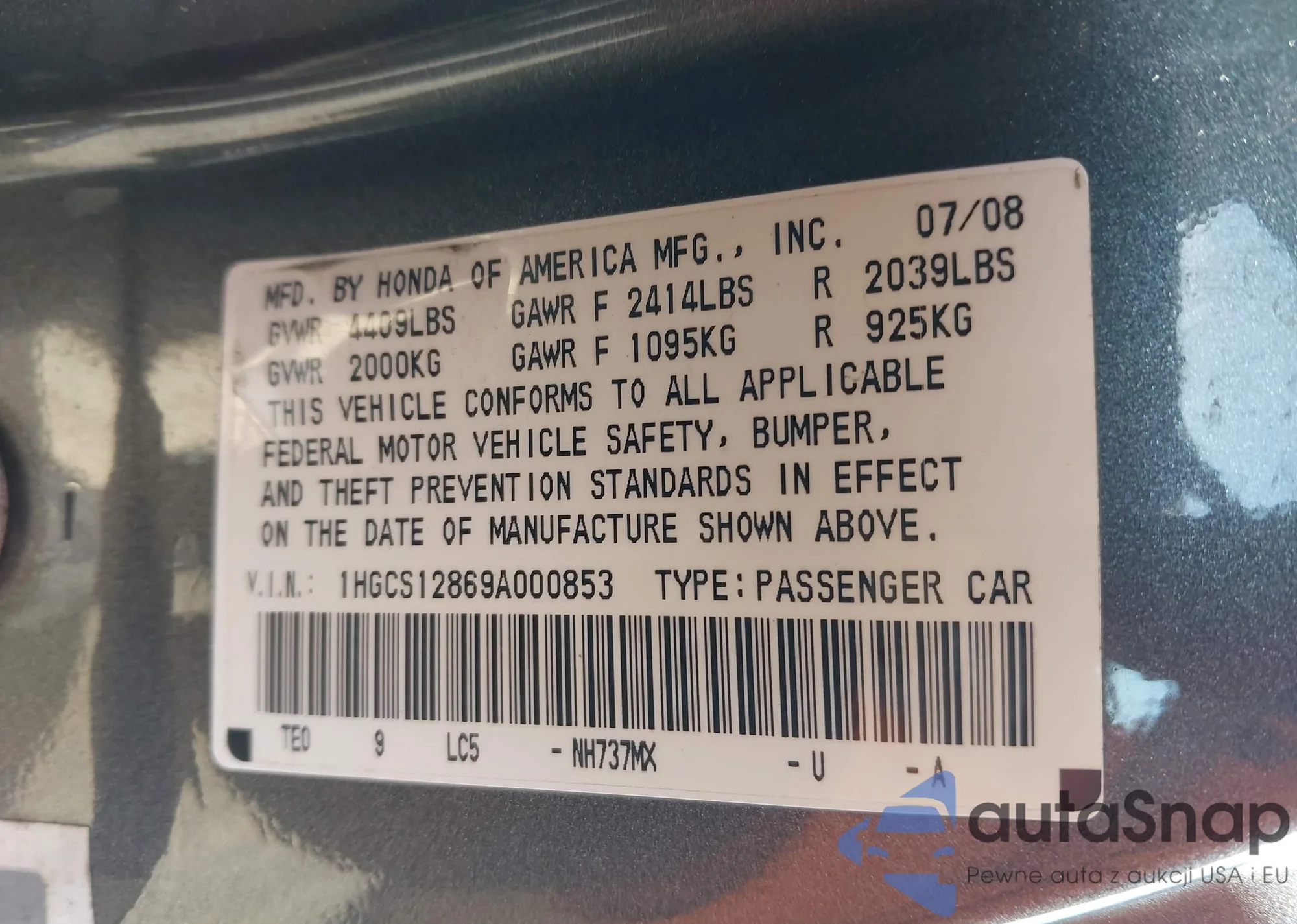LOT: 44661431 VIN: 1HGCS12869A000853