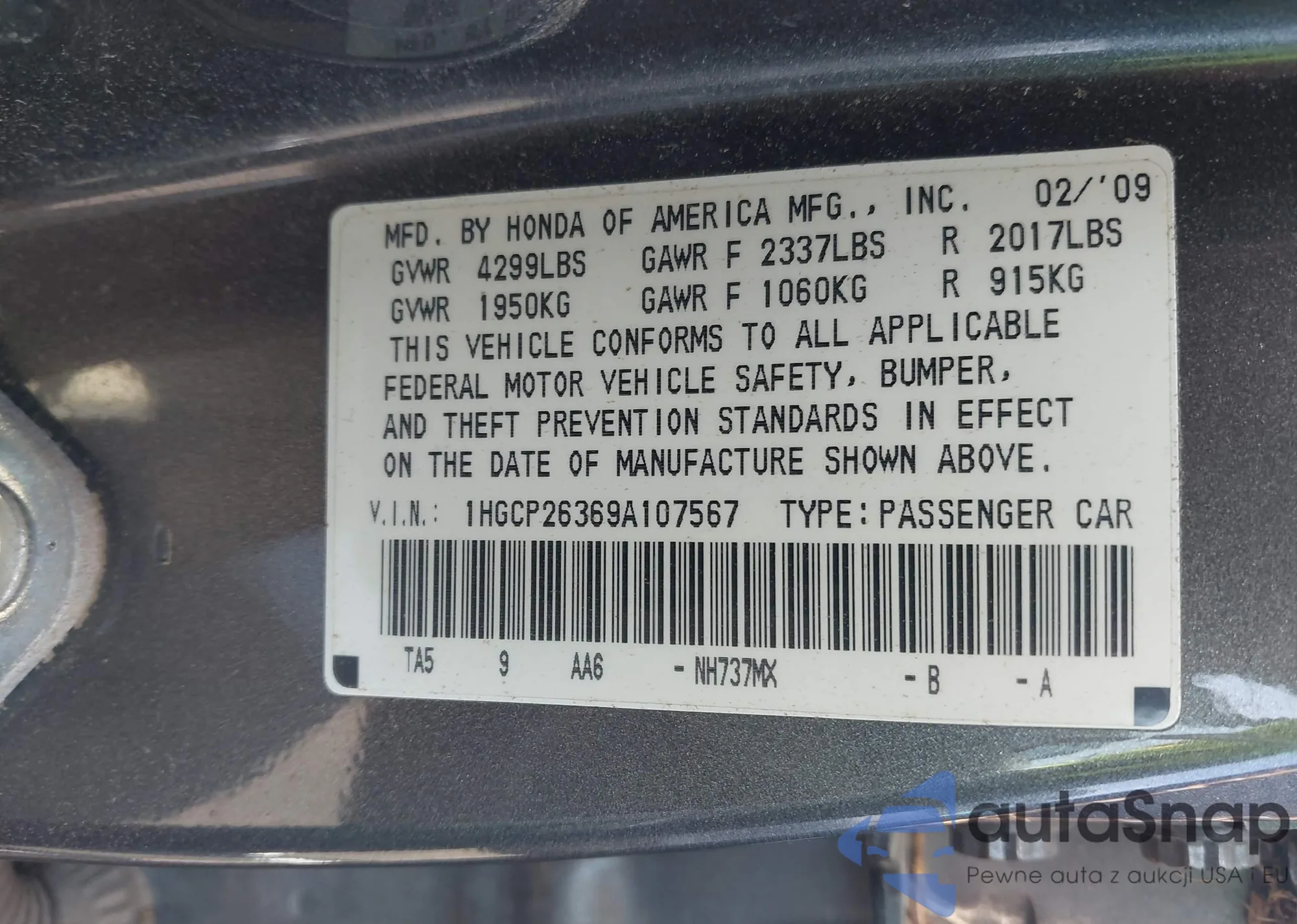 LOT: 43059910 VIN: 1HGCP26369A107567