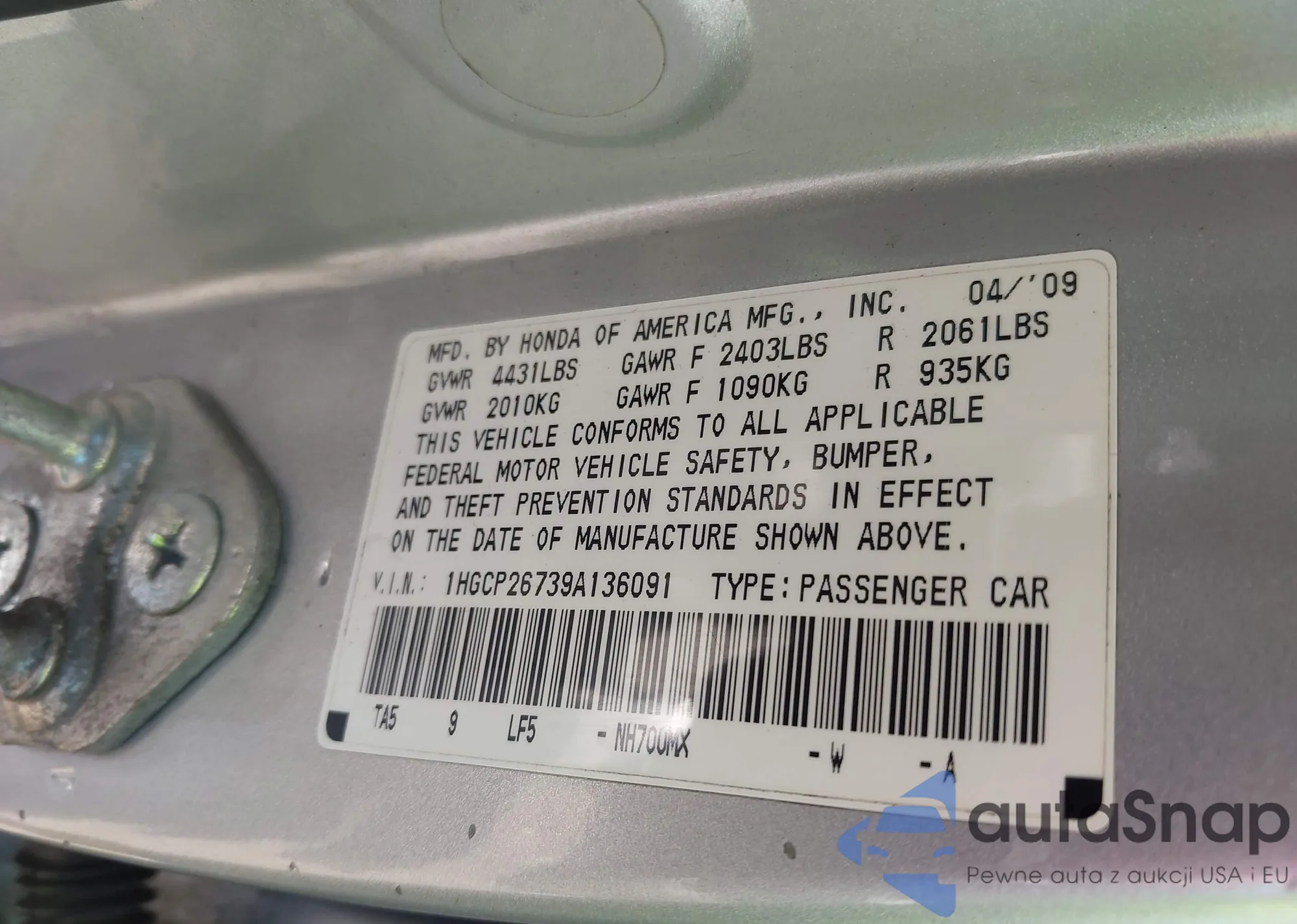 LOT: 43067646 VIN: 1HGCP26739A136091
