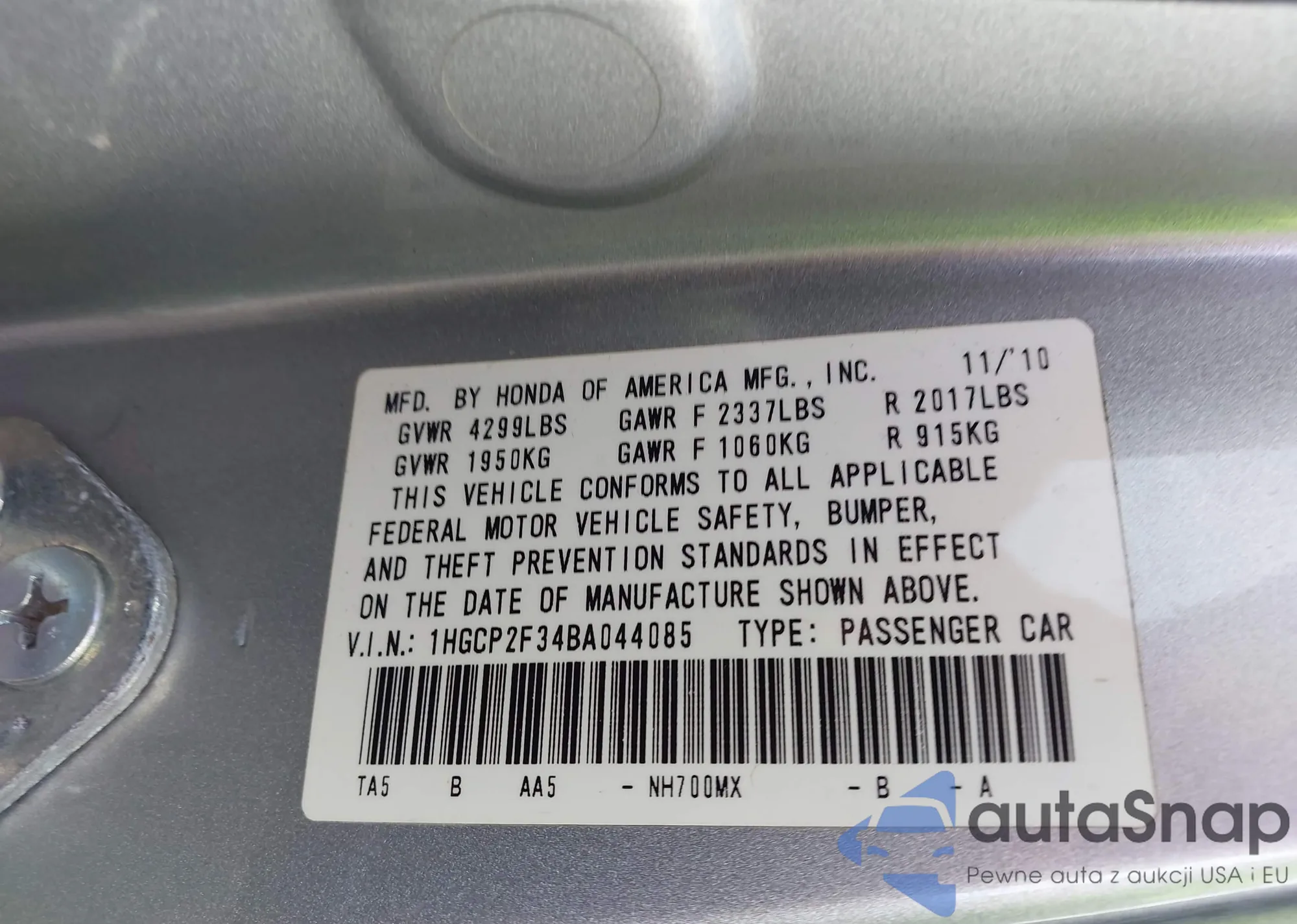 LOT: 43071454 VIN: 1HGCP2F34BA044085
